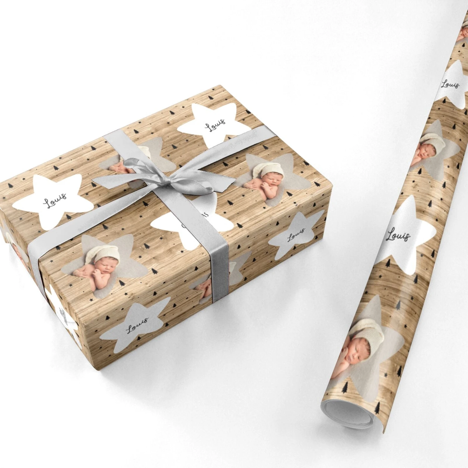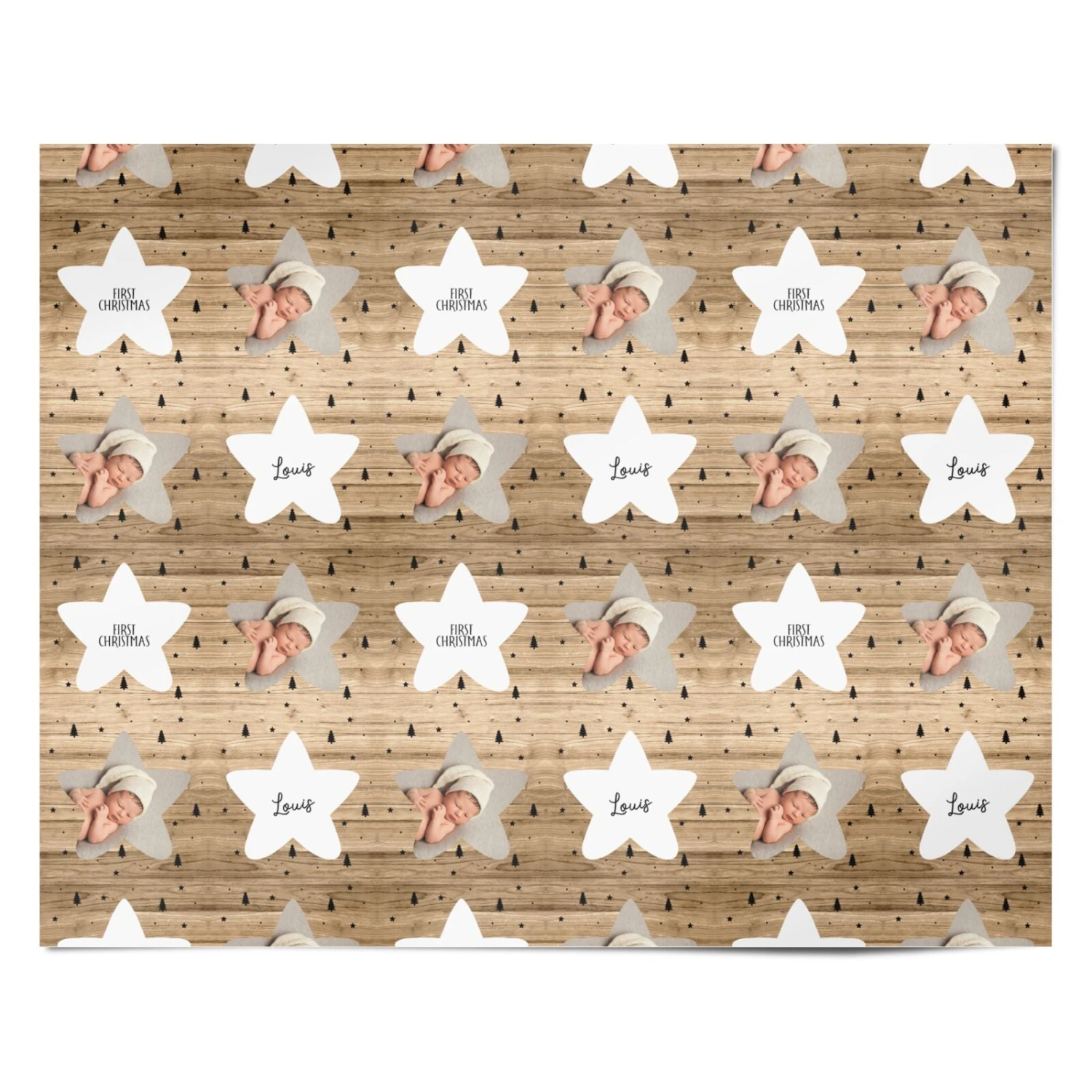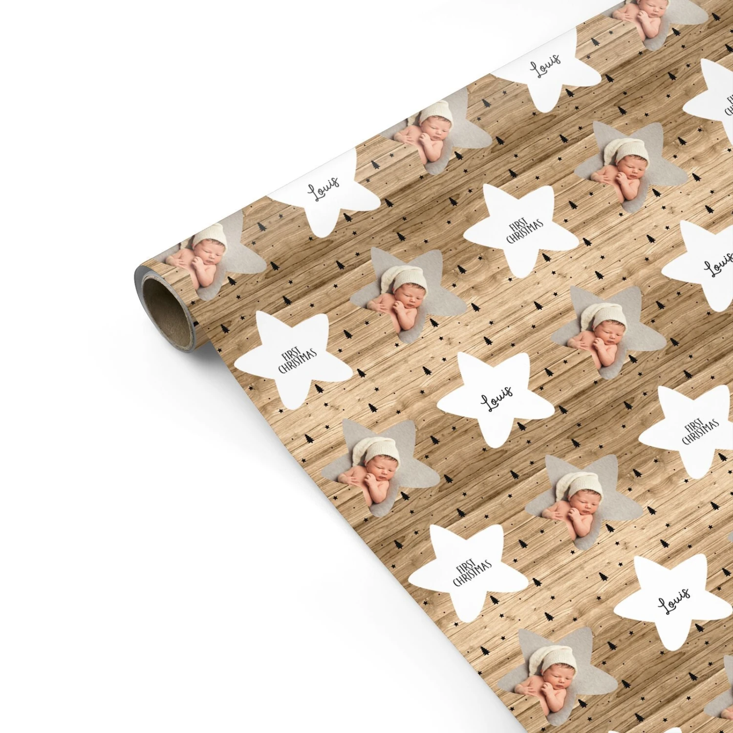 Our Baby Photo Upload Wrapping Paper is a cute design featuring a photograph of your baby, in the shape of a star. Below which you can add a name. The design is set on the wooden effect background. Perfect for the festive season.