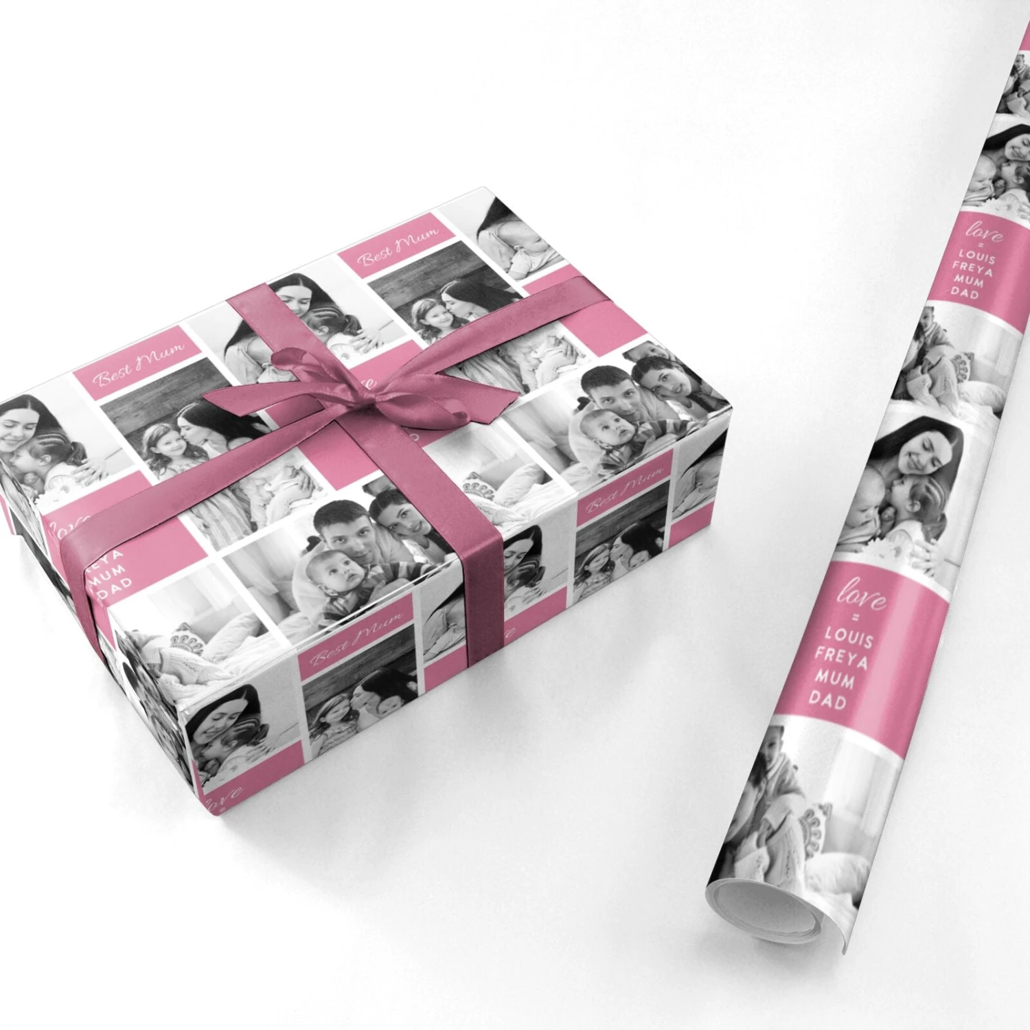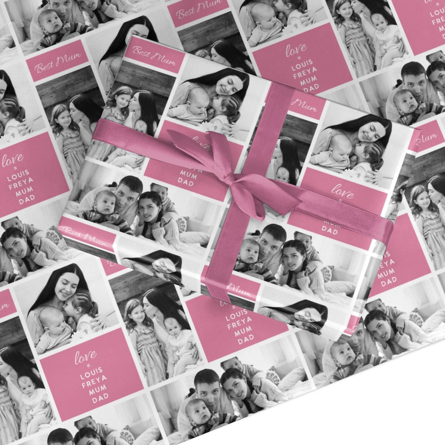 Our Best Mum Photo Collage Personalised Wrapping Paper is a great gift idea for Mum this Mother’s Day. Upload three of your favourite family photos and add the names of your family members, and children.
