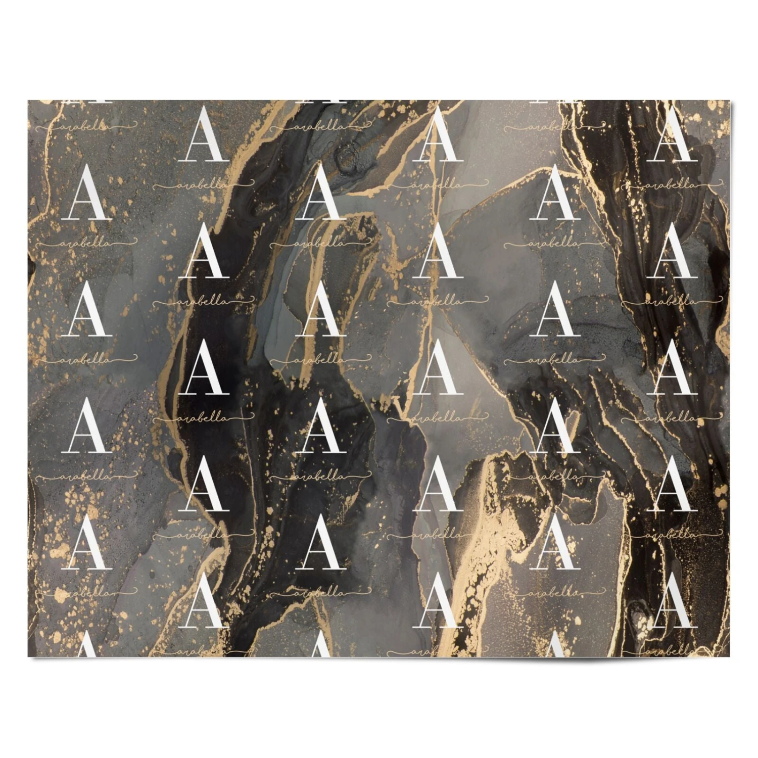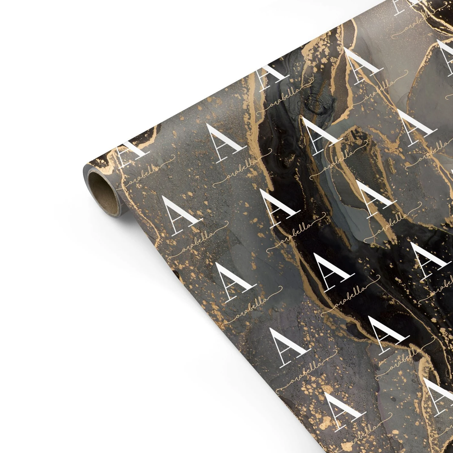 This personalised Black and Gold Marble design features a bold large initial and a custom script name underneath. Customise this unique marble design with your desired name for a contemporary and stylish gift wrap.