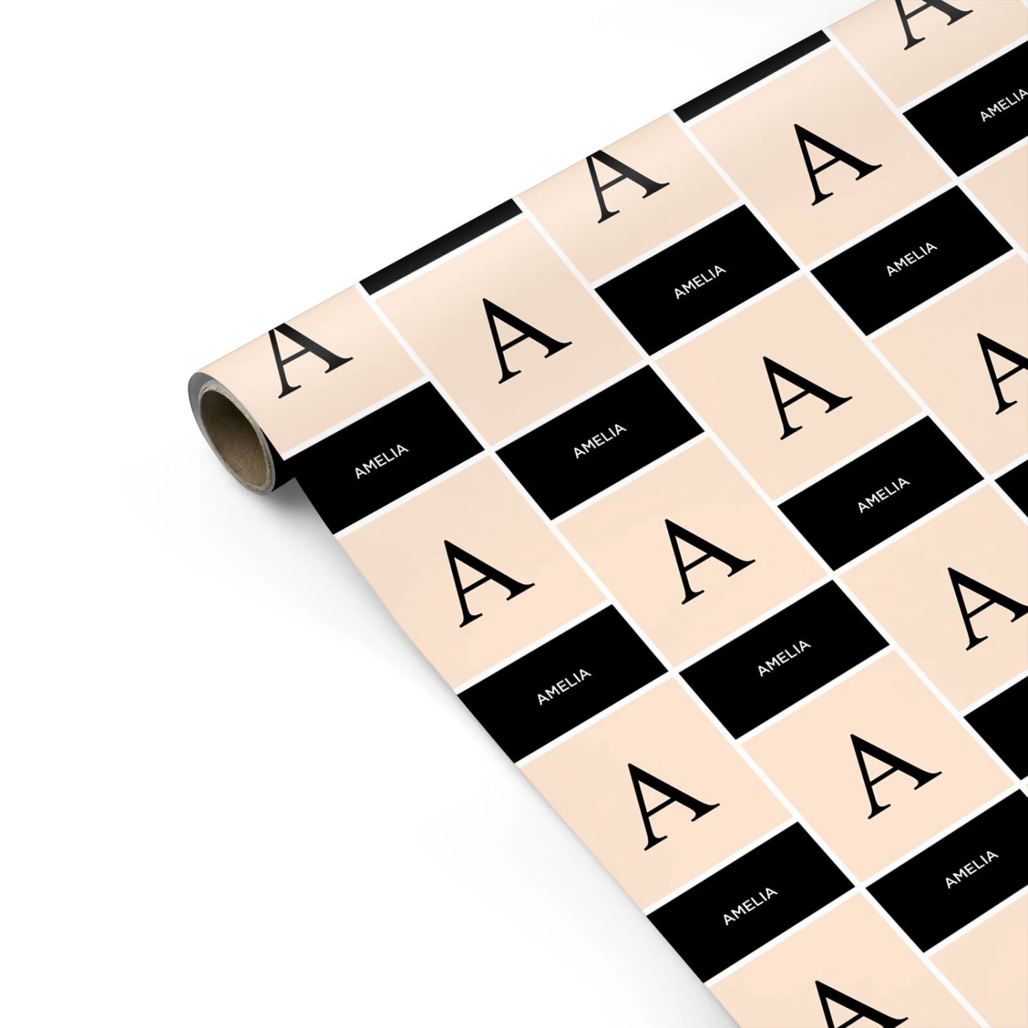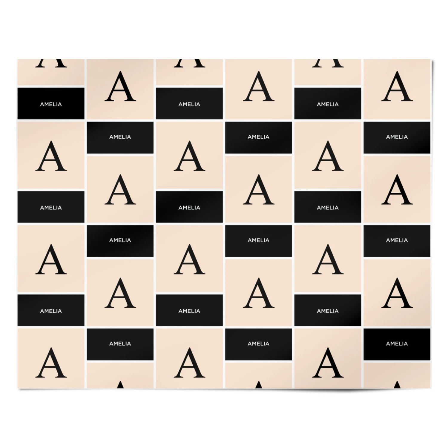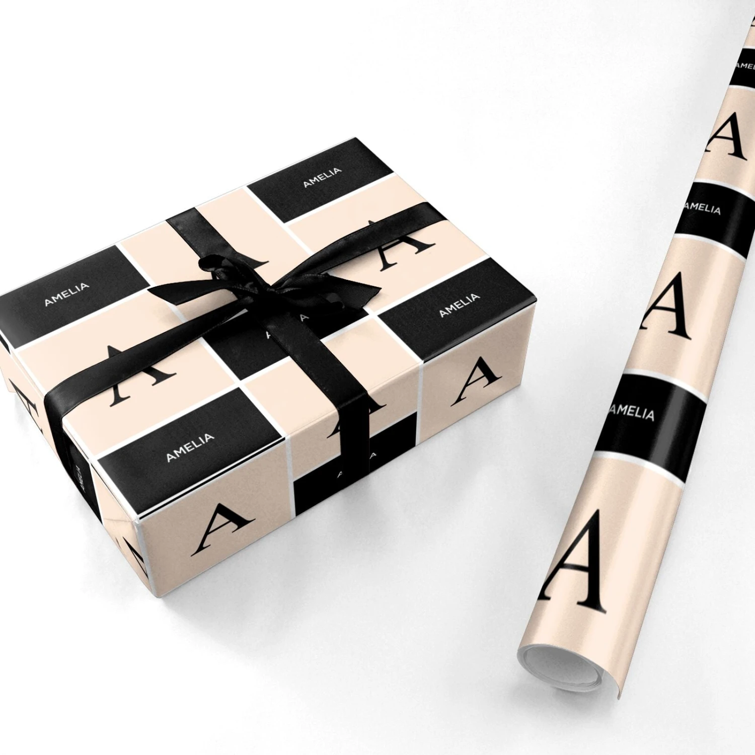 Our Black Neutral Personalised Initial Wrapping Paper is a striking modern design with black and nude colours, with a large monogram and name. On-trend and modern, perfect as a personalised gift.