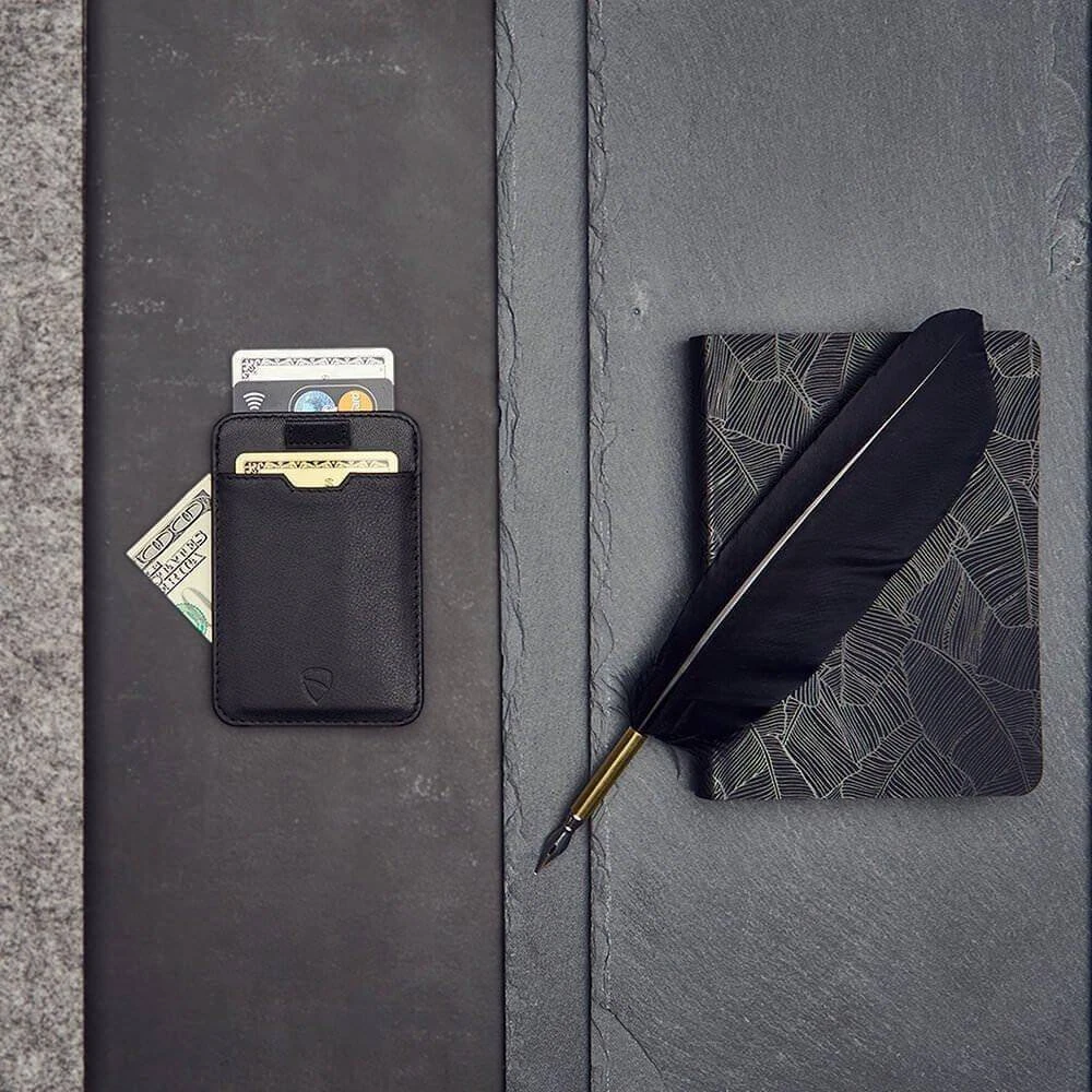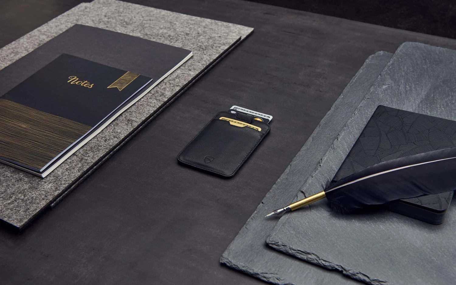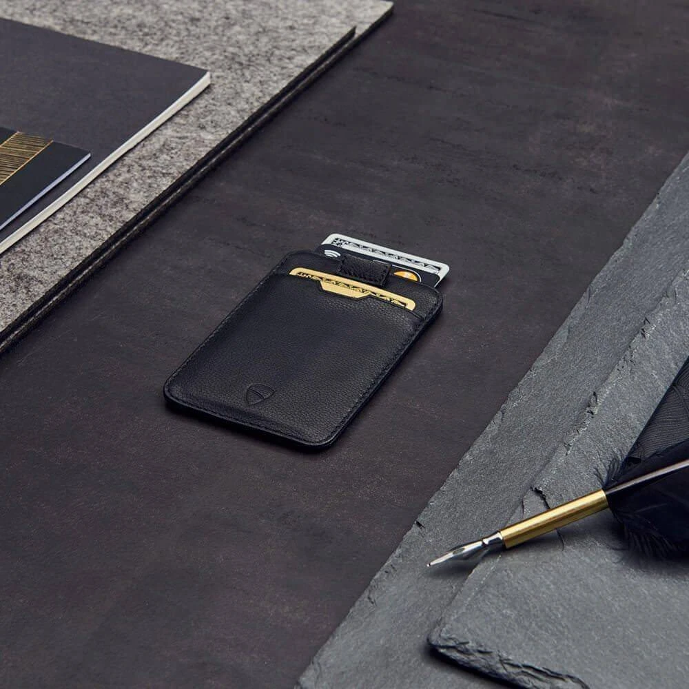 The most minimal wallet of all works for everyone. A super-slender combination of elegance and RFID security that fits even in a shirt pocket HIGH CAPACITY IN THE SKINNIEST WALLET OF ALL CHELSEA can store up to eight bank or ID cards without compromising on ease of use…and still stay impossibly thin and light. The design concept is to fold banknotes into a card slot instead of making a wallet with one side folding over the other. This reduces size massively, without reducing capacity. Naturally, everything is RFID protected and easy to access. ANTI-THEFT IN A PRO-AESTHETIC FORM CHELSEA’s premium leather is strong and engineered to be an exact fit for bank cards, so you can just put one card in each of the three slots if that’s all you need, and they’ll stay put. The leather is also supple, so if you add more cards to each slot, it will stretch to fit. Vaultskin’s high-performance electromagnetic material is thinner than silk so even in CHELSEA, it doesn’t add bulk when it’s concealed in the lining to give all your cards RFID protection. FUNCTIONALITY REMAINS A PRIORITY The two outer pockets allow easy access to cards or folded banknotes, and cards in the centre section pop up when you pull the smart strap, which self-retracts back in place. SOPHISTICATED SIMPLICITY Whoever you are, whatever your style, however close-fitting your clothing, CHELSEA is a sophisticated solution. Not much bigger than a single bank card, it gives you choices and security. You can take an array of cards – pick up some cash for taxis and tips with your debit card and pop the notes in a slot, and you can go wild with your credit card for bigger buys. Your cards will all be protected from fraudsters with scanning devices that can steal money from your accounts or your ID information for bigger crimes. It takes a lot of thought and refinement to create something as simple and functional as this. Technical details