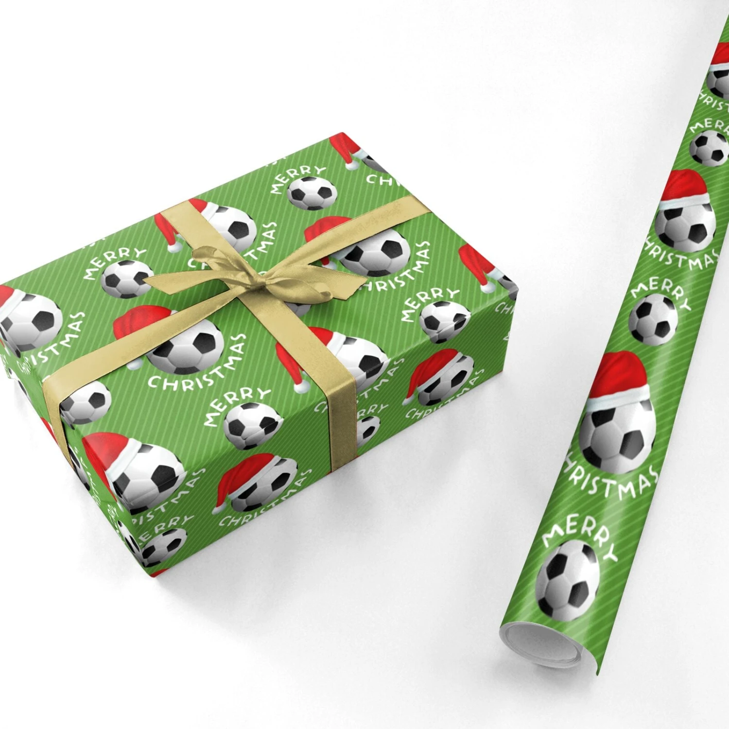 Touchdown! This football-themed Christmas wrapping paper is the ultimate gift for the sports fanatic in your life. This one-of-a-kind wrapping paper takes the joy of the holidays and the excitement of the game and combines them into a festive package they’ll love. Whether you’re wrapping up the perfect gift for your favorite quarterback, coach, or football enthusiast, this paper is sure to score big. Elevate your gift-giving this season with a touch of seasonal spirit and sporty style. Featuring a football wearing a Santa hat against a green background.