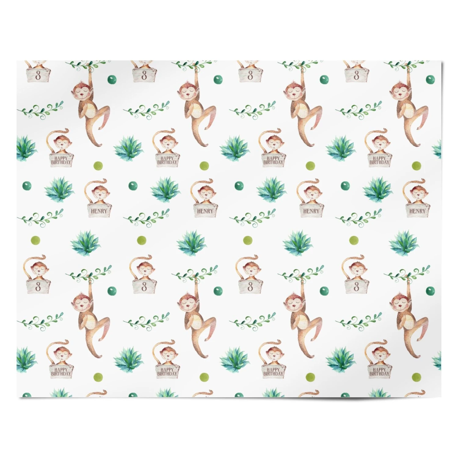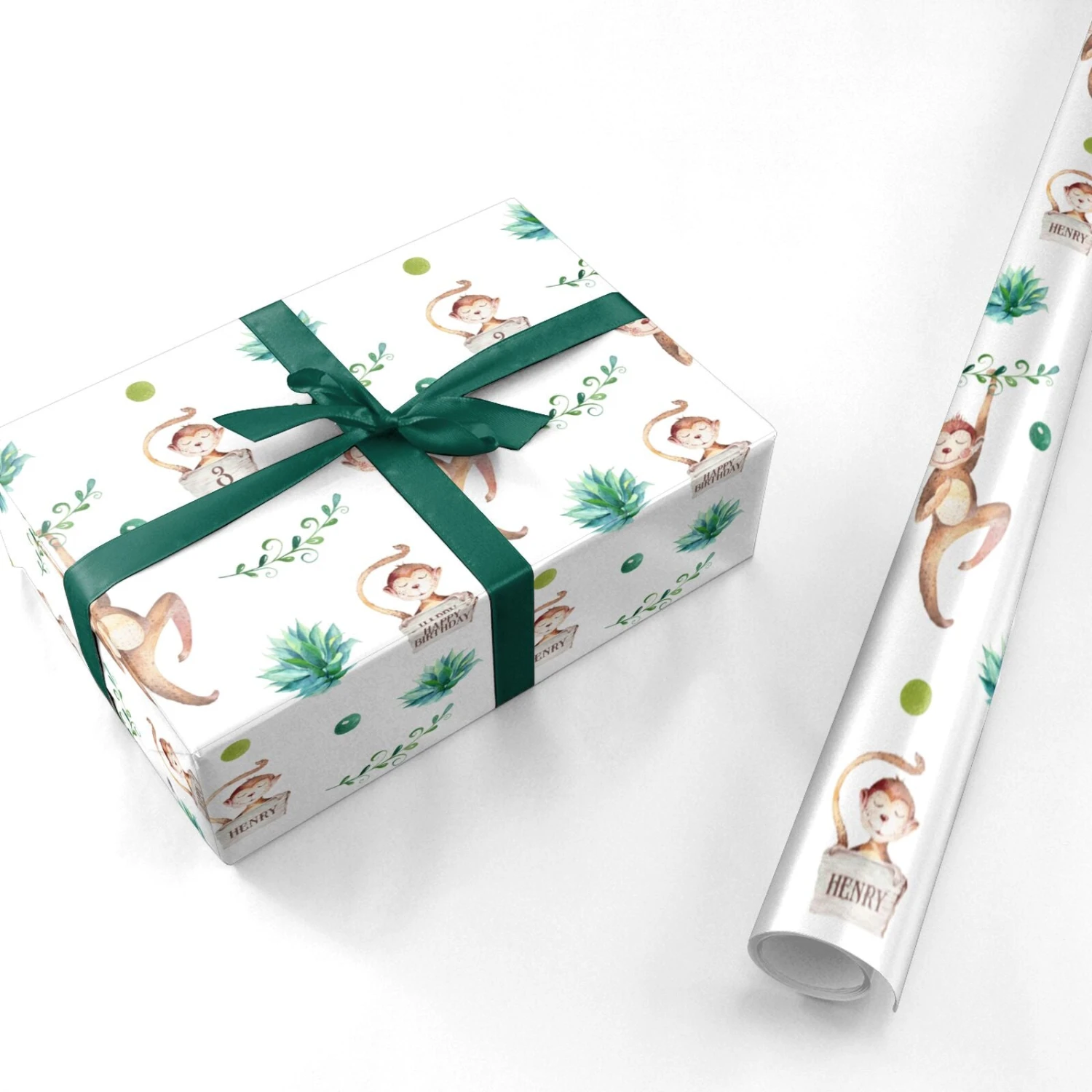 Our Monkey Personalised Happy Birthday Wrapping Paper is a watercolour illustration of monkeys in the jungle. Perfect for young boys birthdays, for a safari theme or animal theme birthday party. Customise the design with a name and age to make it your own.