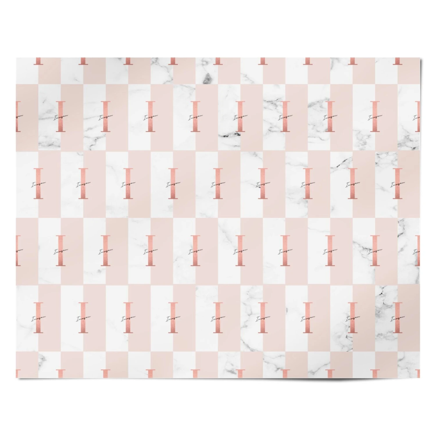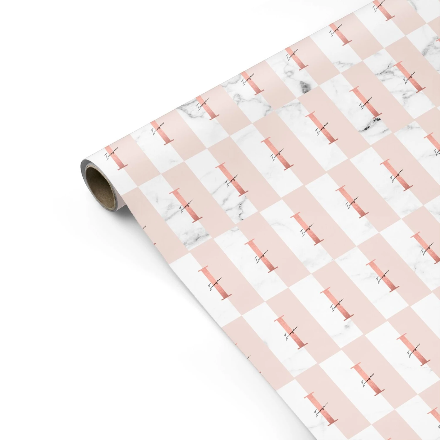 This Monogrammed Rose Gold Marble Wrapping Paper is a natural white marble design to the left of the pattern, with a nude pink plain block to the right. In the center we have a large rose gold effect initial, along with a black signature font name.Â