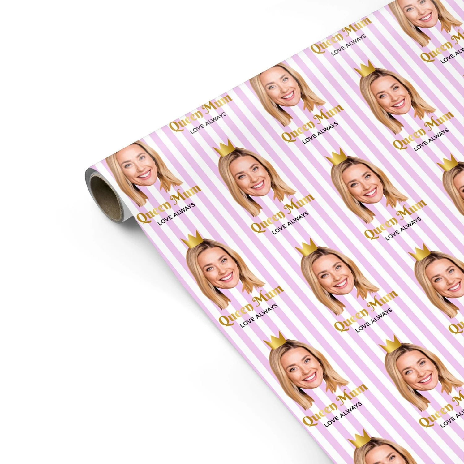 Introducing our Mothers Day Photo Face wrapping paper. The perfect wrapping paper for all of those Queen Mum’s out there. Featuring pink stripes and customisable photo face and text. This stylish design is sure to impress any Mum this Mother’s Day. Inspired by the stripes of the Beverley Hills Hotel!