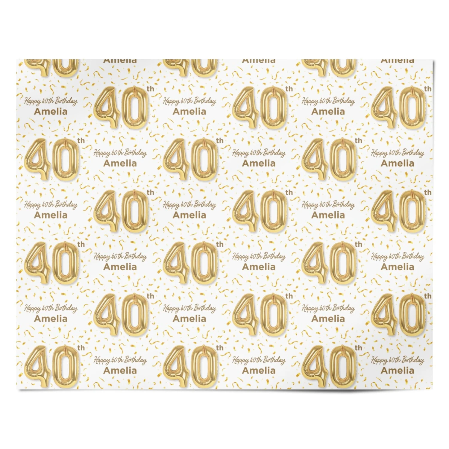 This Personalised 40th Birthday wrapping paper is perfect to celebrate your 40th in style. This gold and white design with balloon style numbers looks great when teamed with the matching decor and accessories. Customise with a name of your choice and view in our personaliser tool. This extra special wrapping paper is perfect for any 40th Birthday celebration.