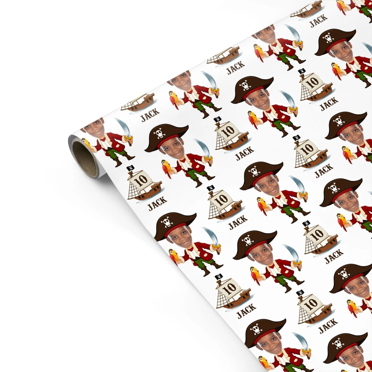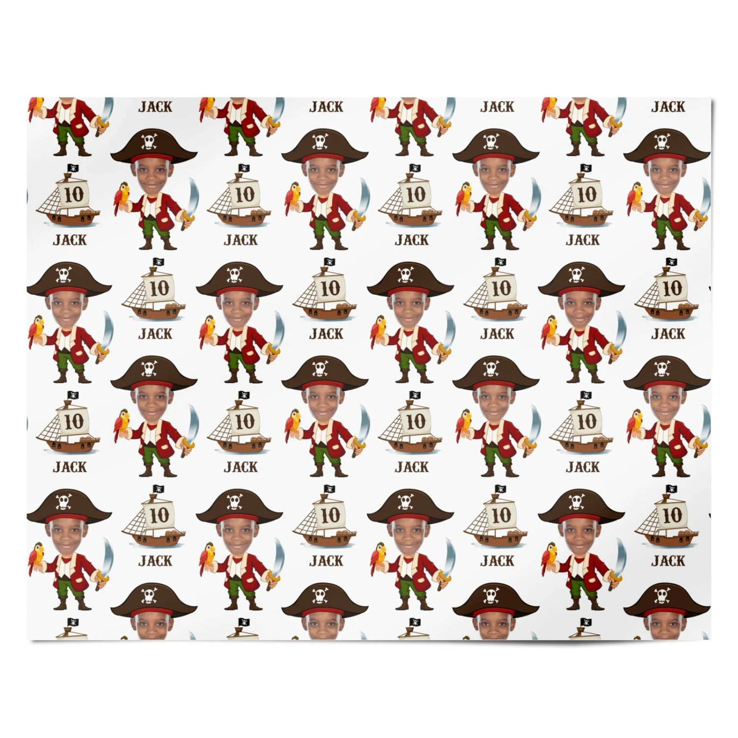 Ahoy there, matey! Bring the high seas to your little pirate’s birthday with our Personalised Boys Photo Face Pirate Birthday Wrapping Paper.