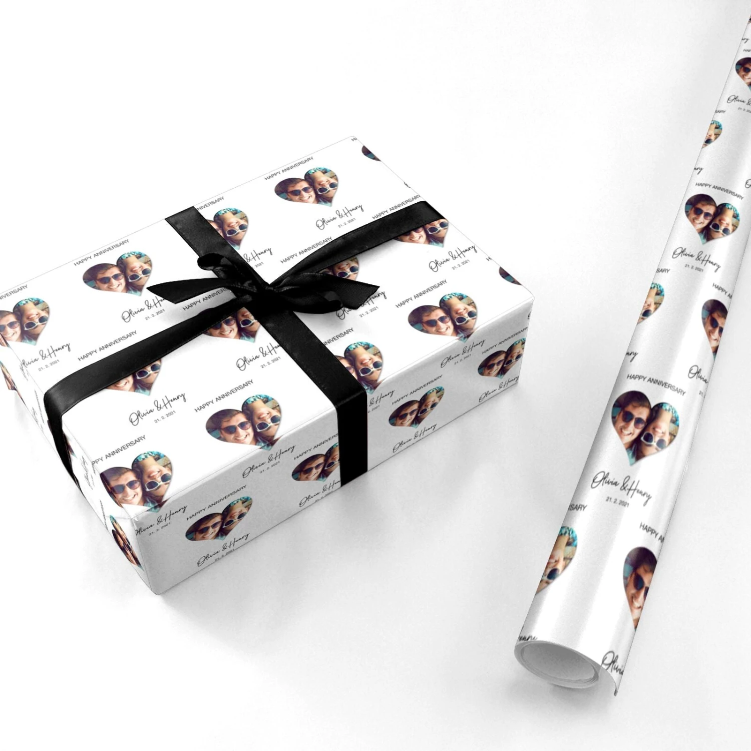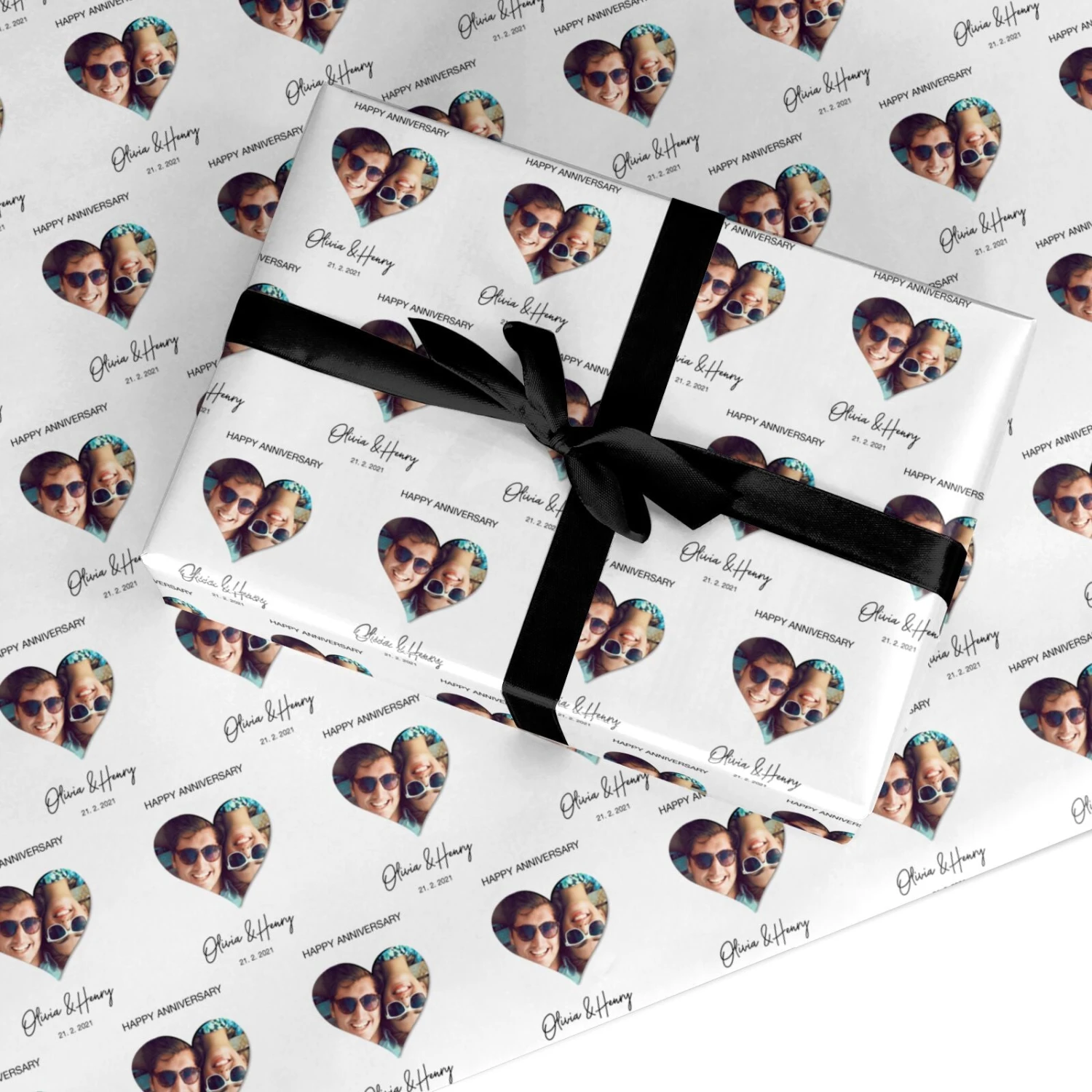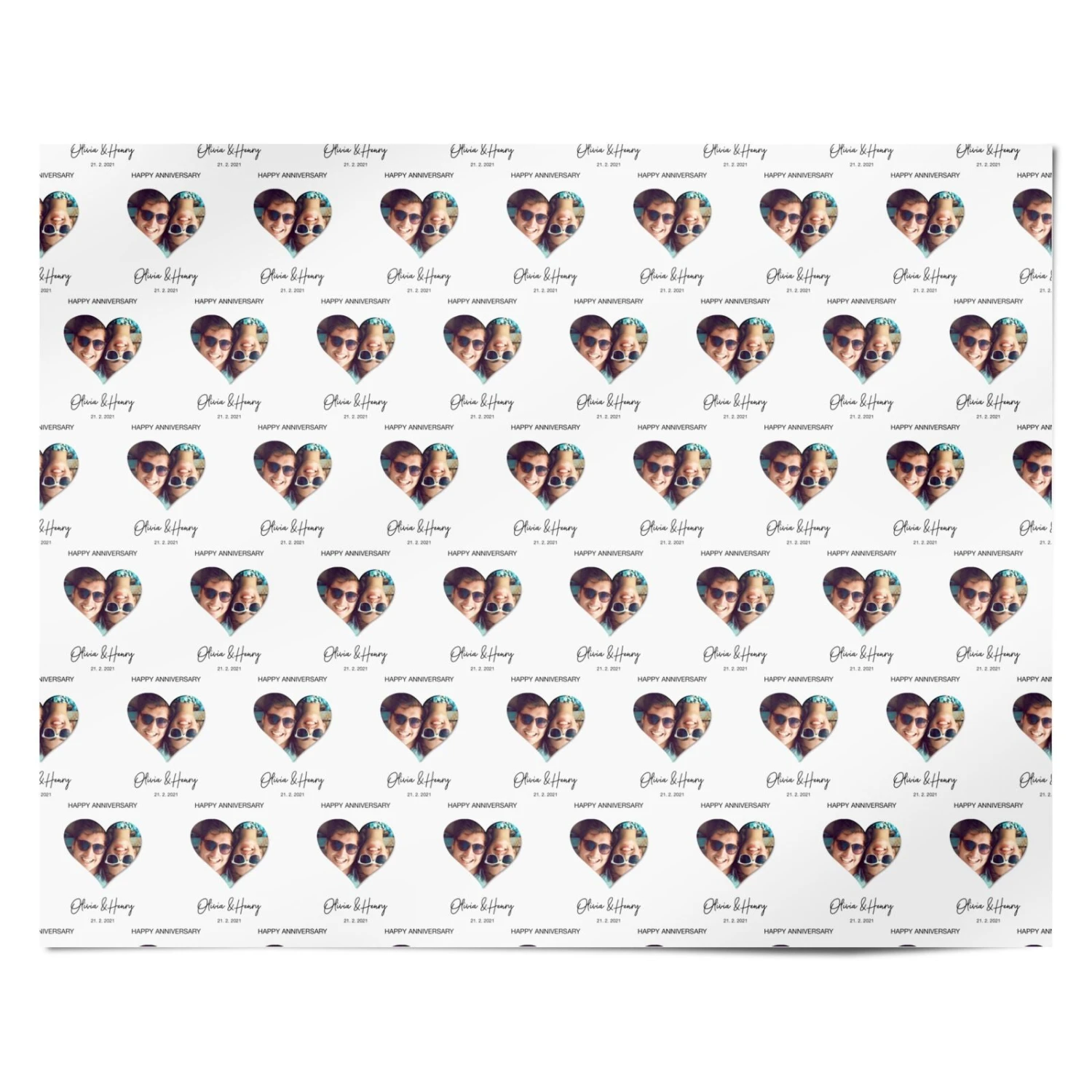Celebrate your special day with this cute bespoke Anniversary card. With our Personalised Happy Anniversary Wrapping Paper you can create a bespoke keepsake, which your partner will treasure forever. This gift wrap allows you to add in lots of special, personalised details. These include your names, the date of your anniversary, and even a special photo of the two of you. You can use our customisation services to upload and position your photo into a cute heart shaped frame.Â
