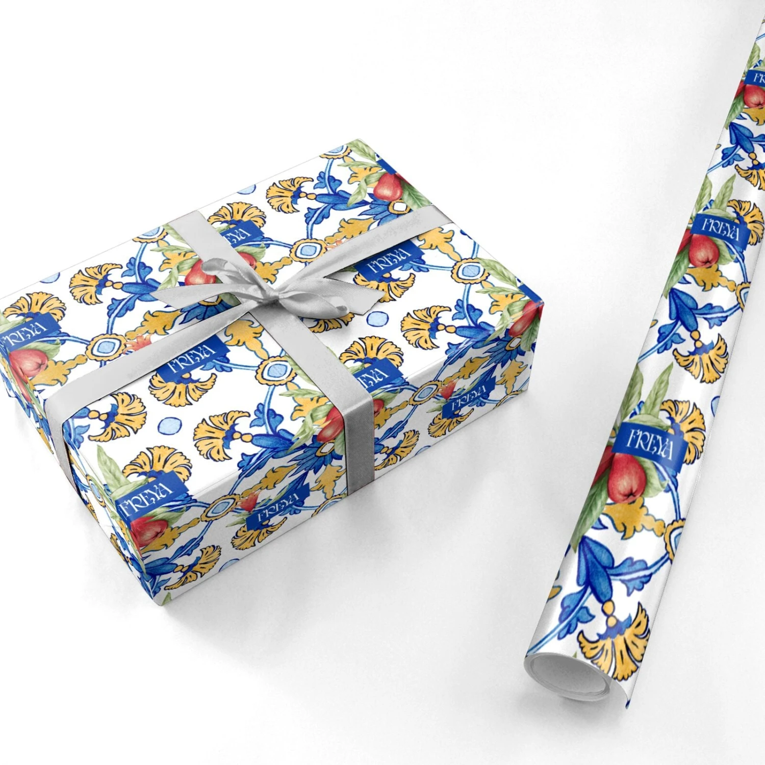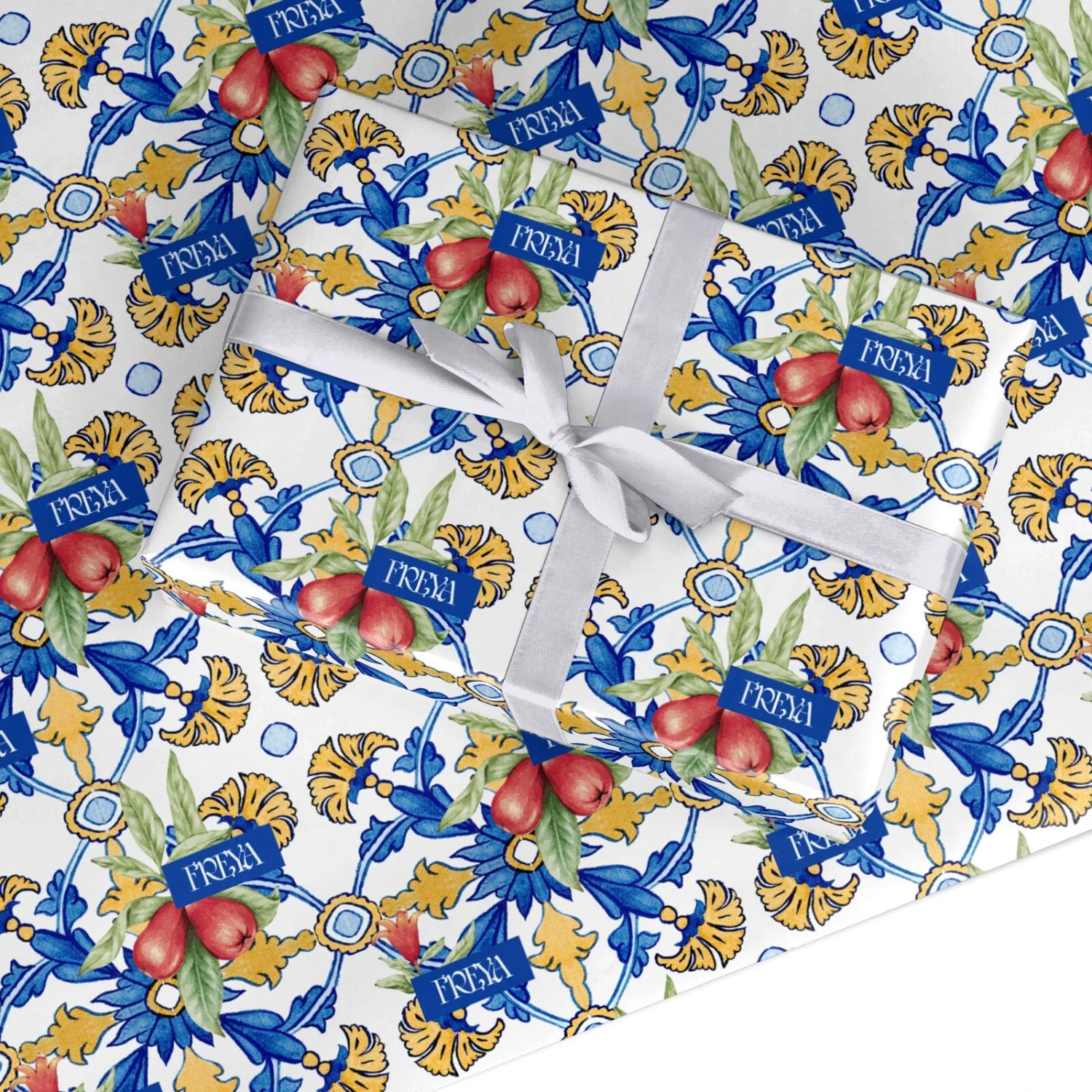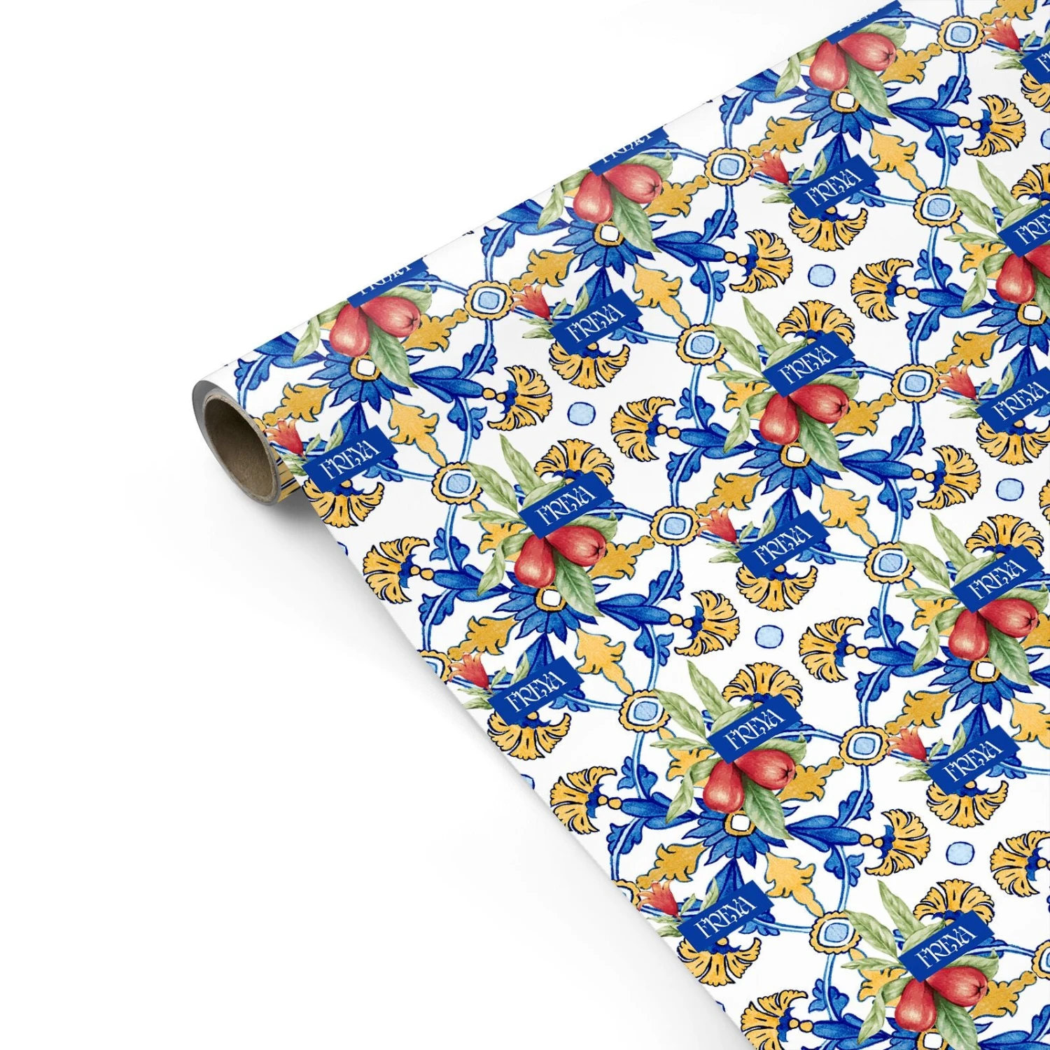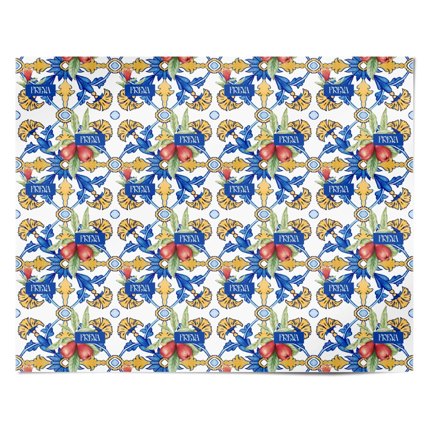 We adore the classic, colourful style of Mediterranean architecture. So, we’ve recreated these traditional, geometric designs, in a bold European style gift wrap design. For our Personalised Mediterranean Fruit and Tiles Wrapping Paper, we’ve created a repeating blue and gold tile print. These are decorated with super realistic paintings of fruit, and the chance for you to upload your name in the centre, in a dark blue frame.Â