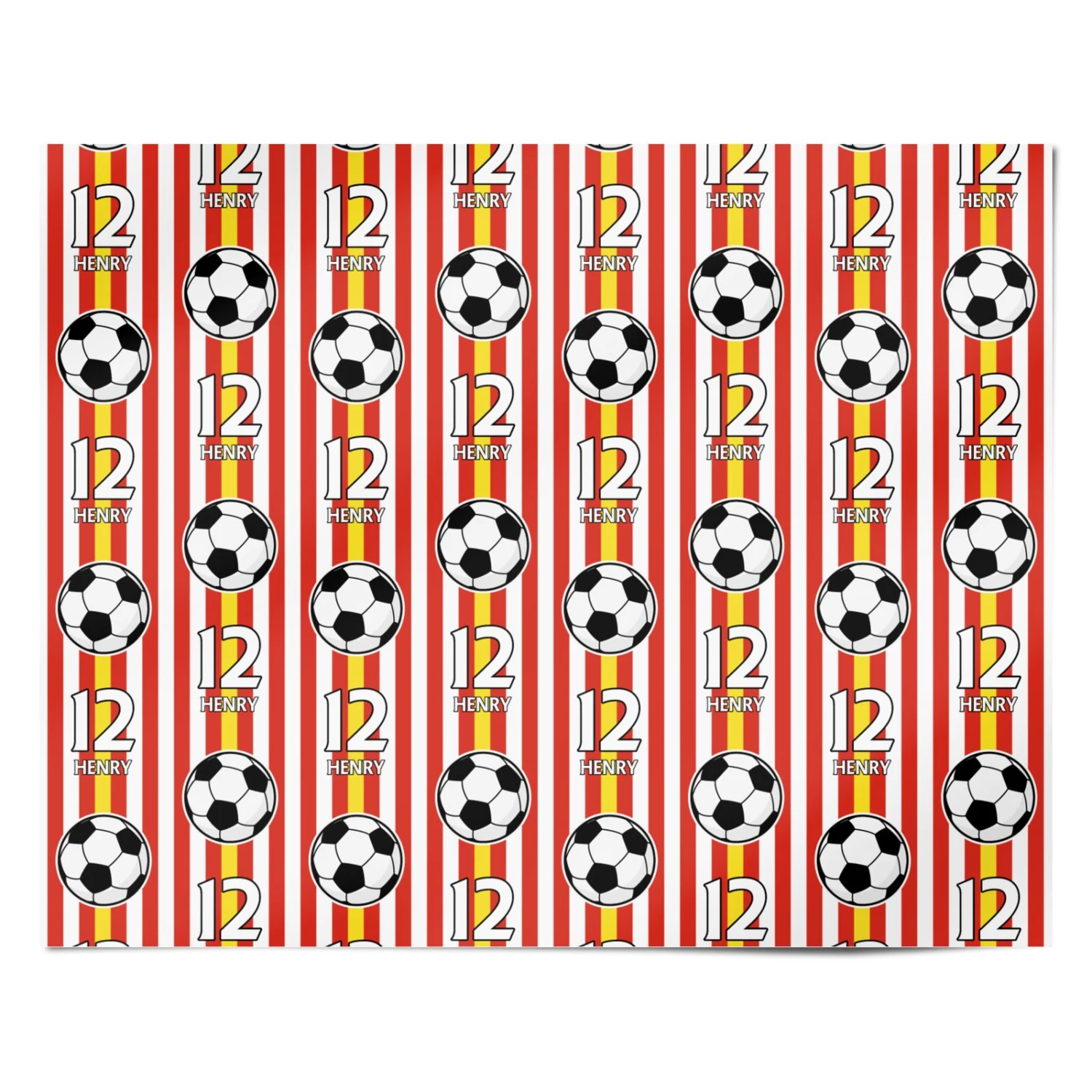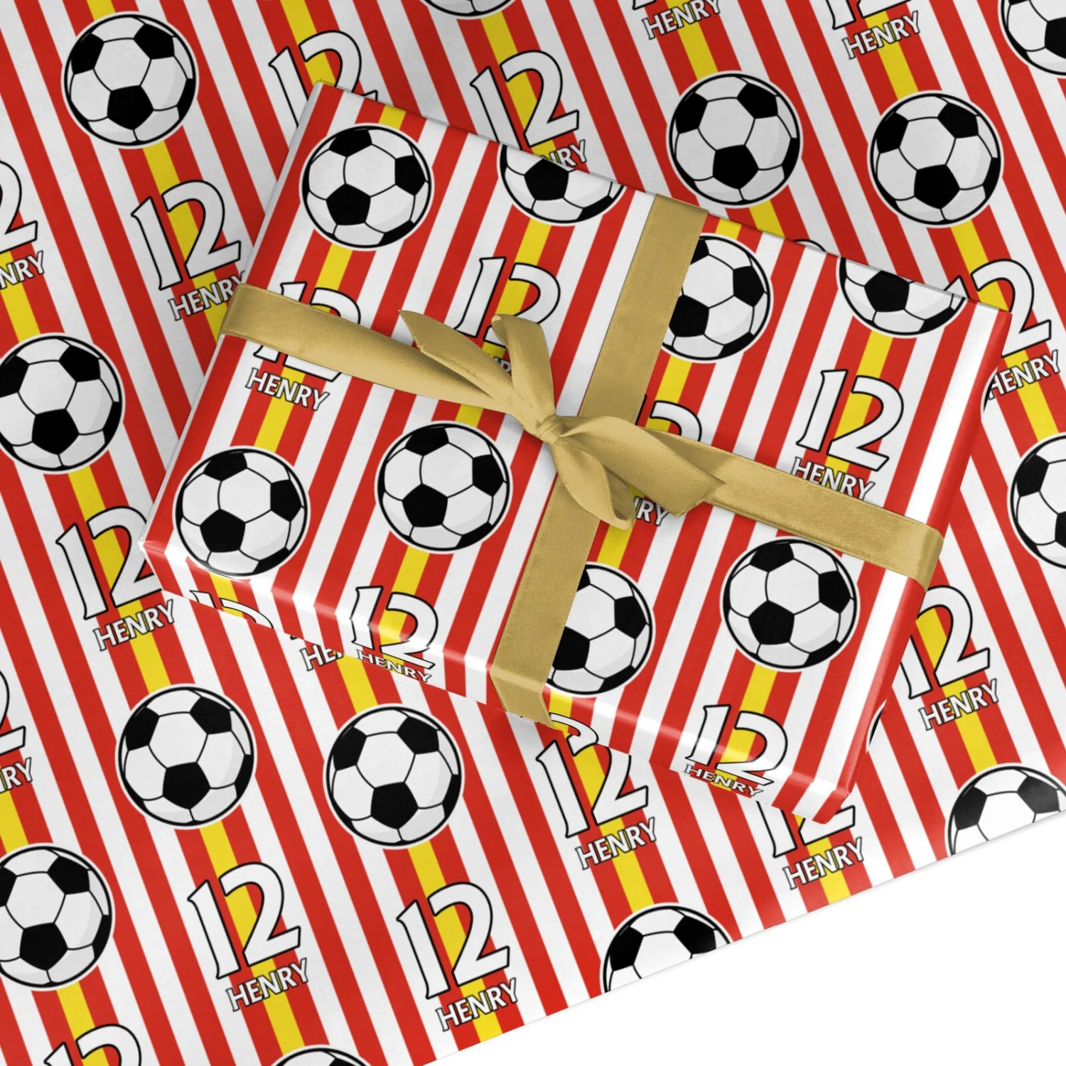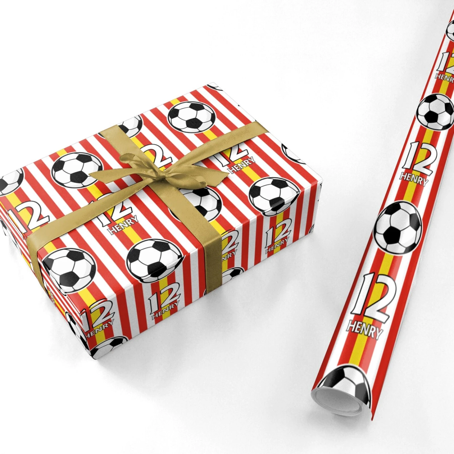 Celebrate football fandom with this customised red, white, and yellow striped wrapping paper, featuring your chosen name and number alongside classic football motifs. Whether you’re wrapping a gift for a young football fan, a dedicated player, or even a proud dad on Father’s Day, this sporty design adds a personal touch to any occasion. Ideal for birthdays, team celebrations, or special match-day surprises, this high-quality gift wrap makes every present feel extra special for football lovers of all ages.