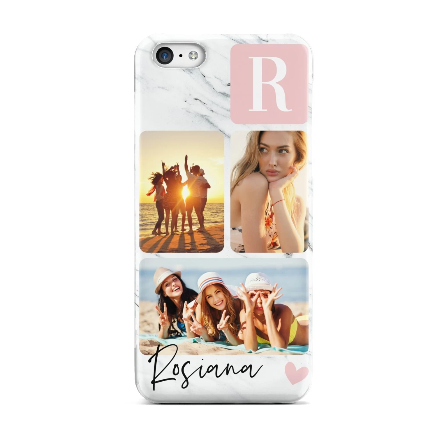 Trendy Personalised Three Photo Name Apple iPhone Case. This design features not one, but three fully customisable images! Simply upload your photos in the live cropping tool to easily arrange and crop them. Each has rounded edges to match the gorgeous, blush pink initial box, which is also personalised to whichever initial you would like. The initial is in a bold white font, to really make your phone stand out, no matter where you are. The design is on a classy marble background, and also features two blush pink hearts to add a dash of girly to the equation! You can fully customise the cursive, black text to a name of your choosing.