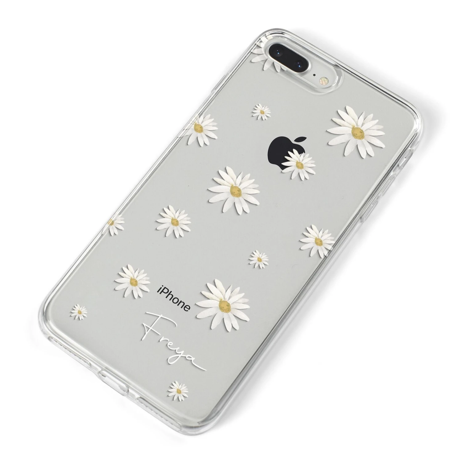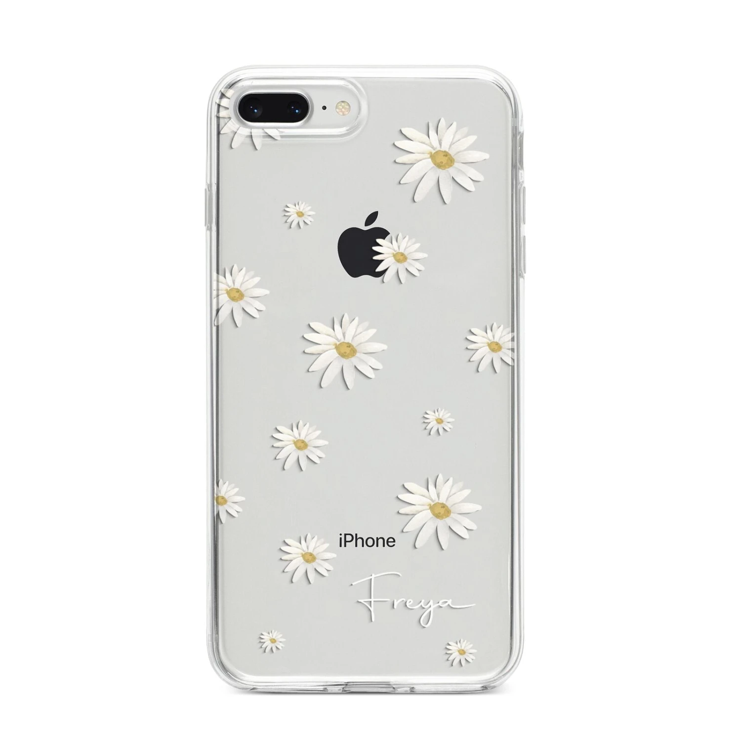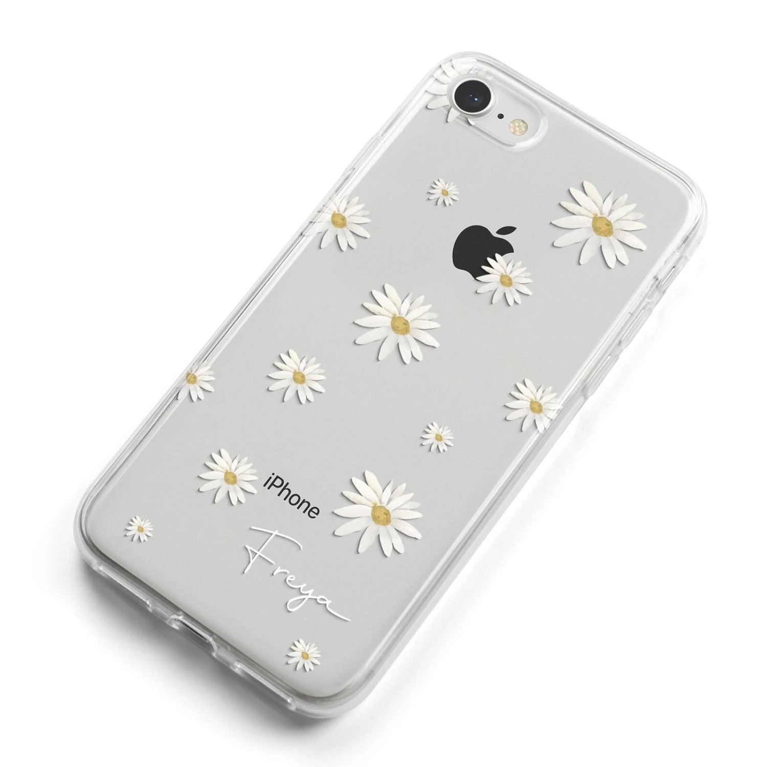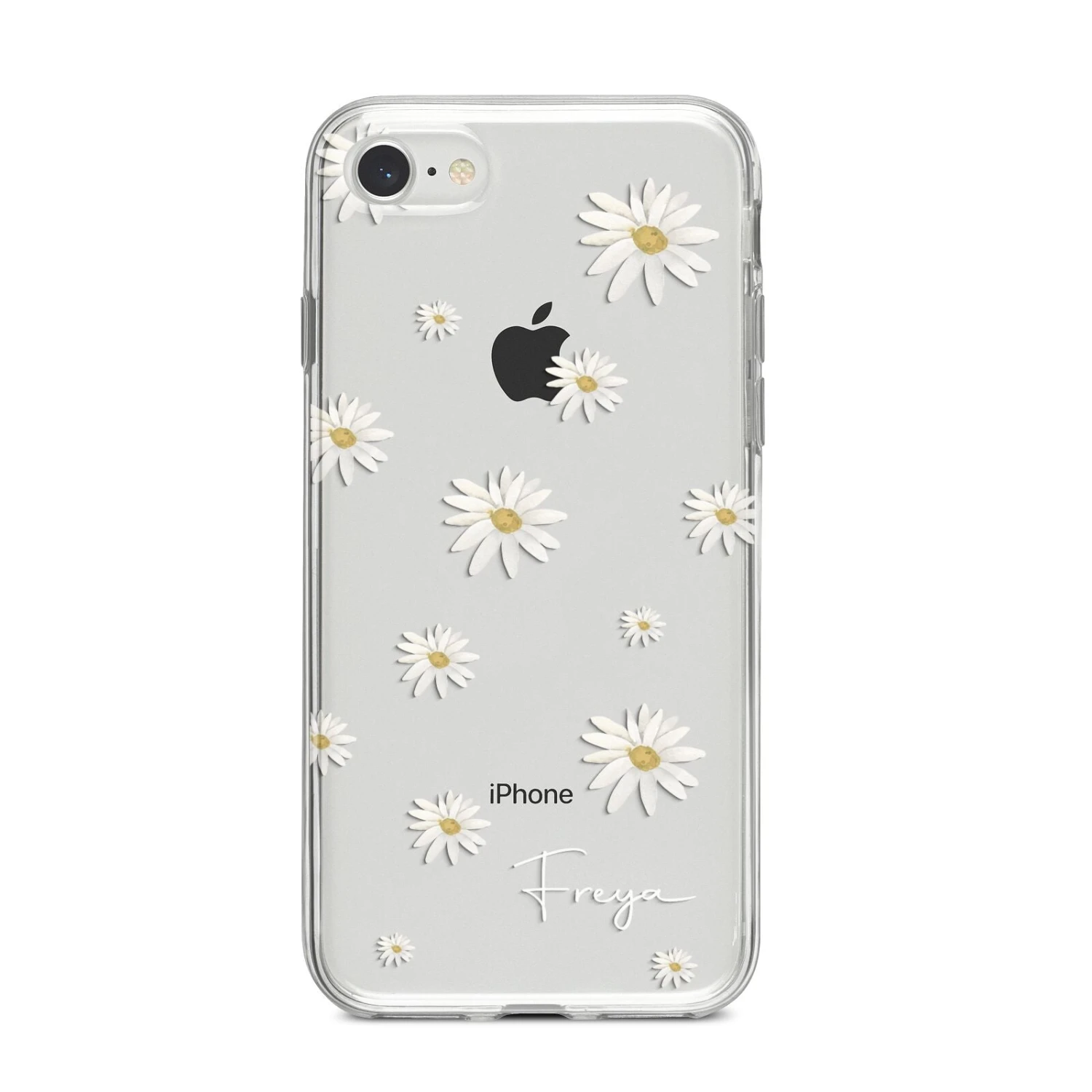 Our Personalised Vintage Daisy Apple iPhone Case is set on a transparent background with a custom name. Add any name you like and we will print it in our handwritten font.