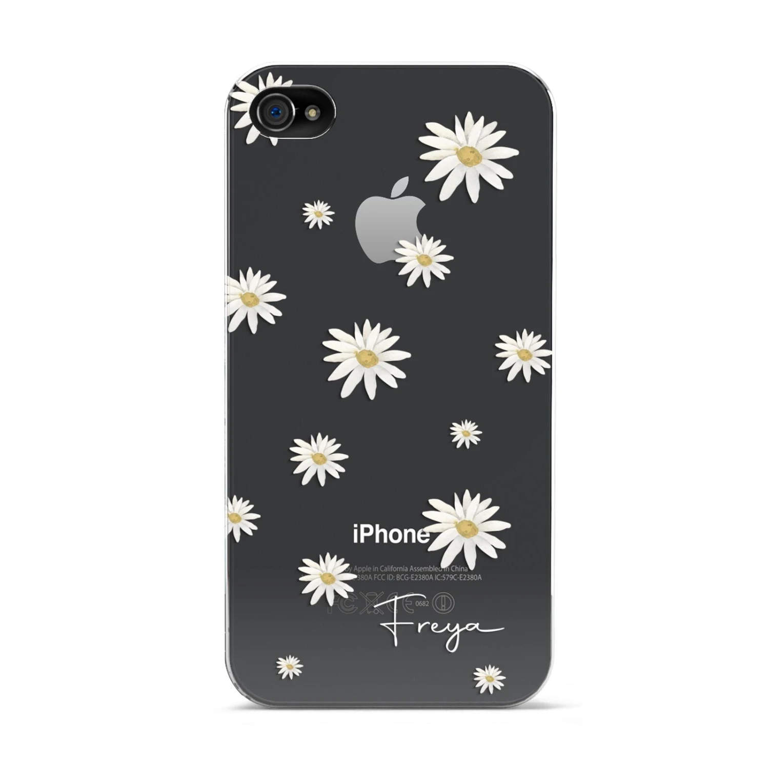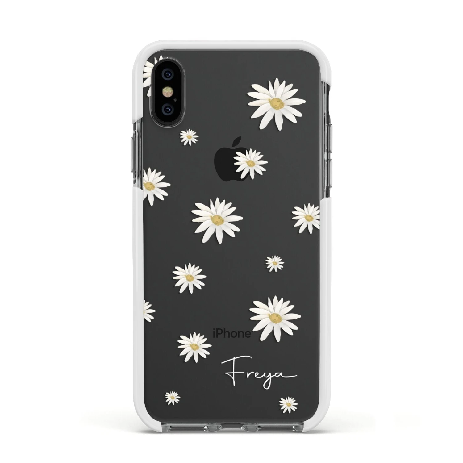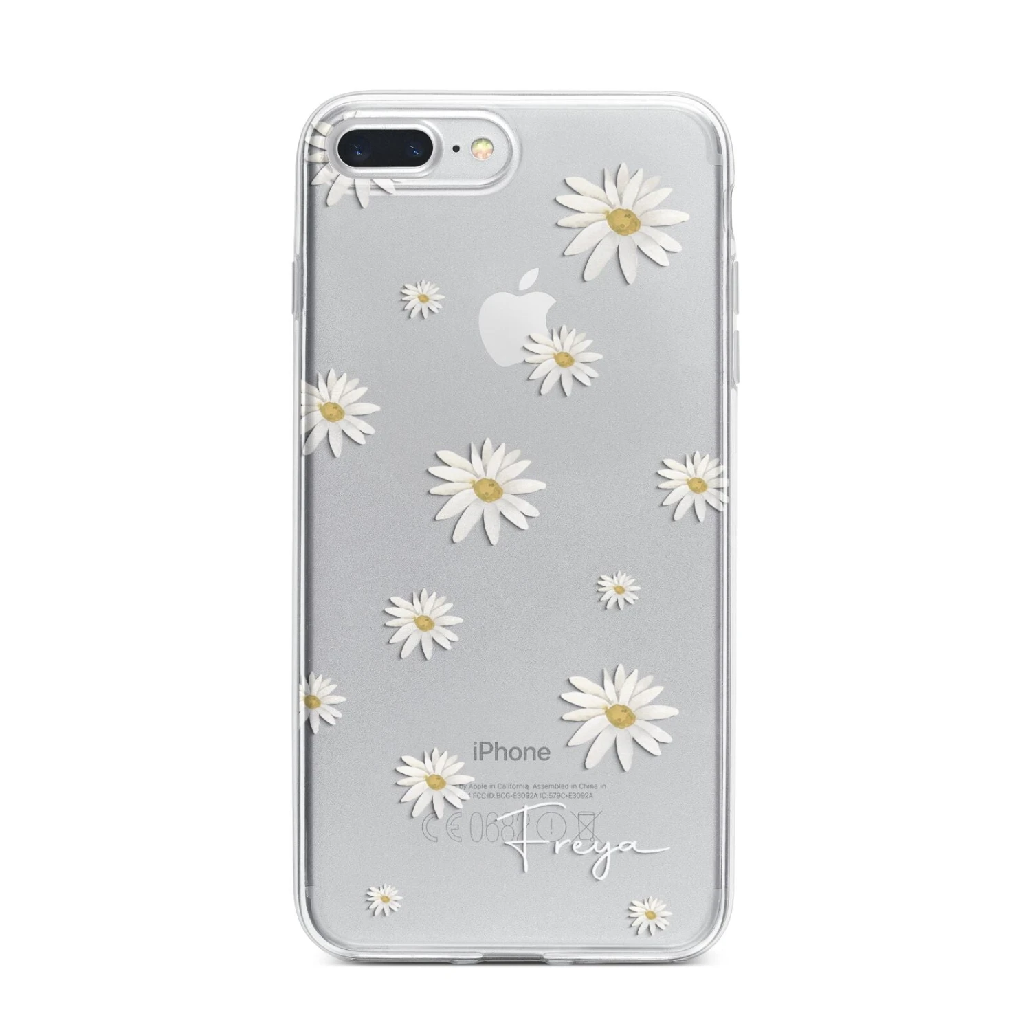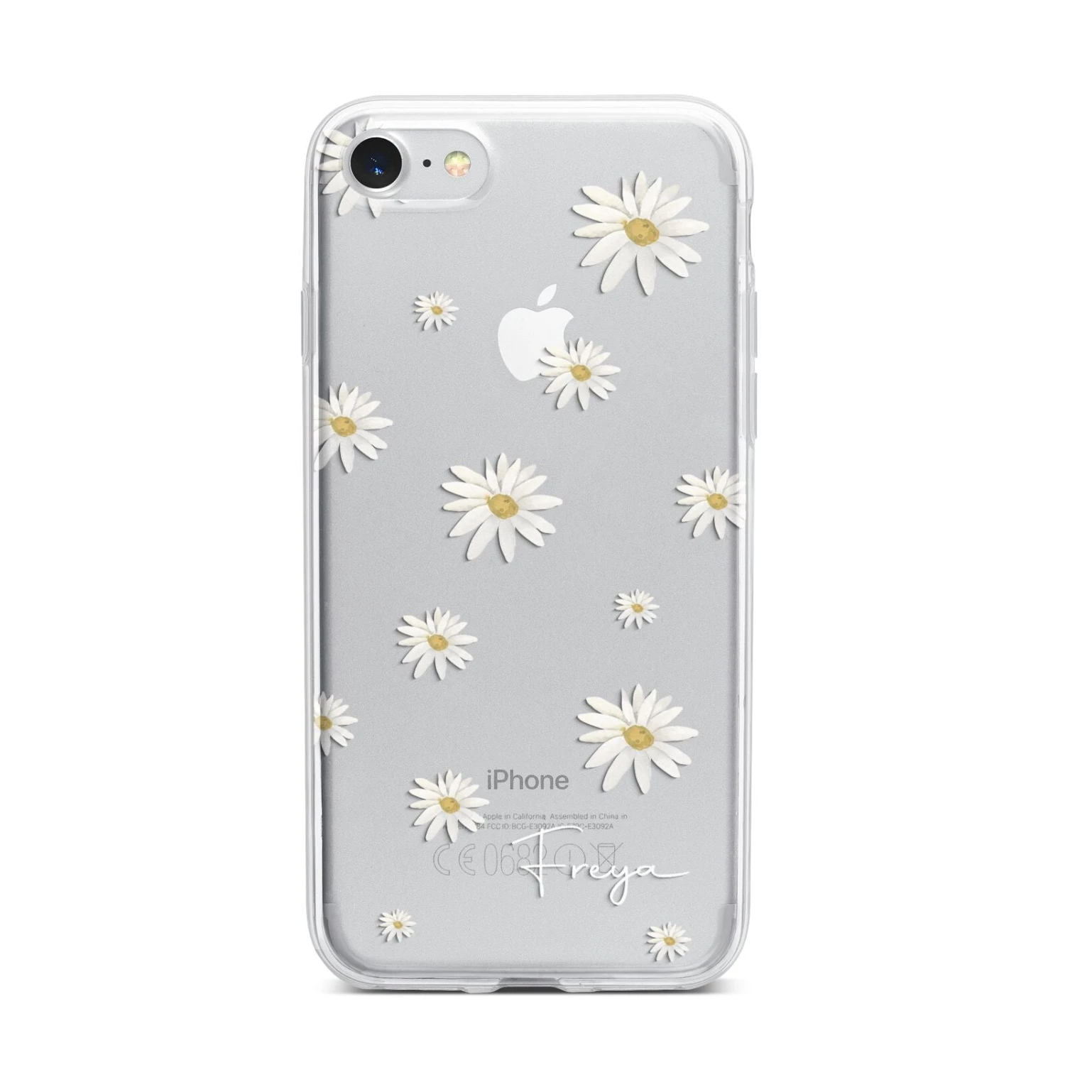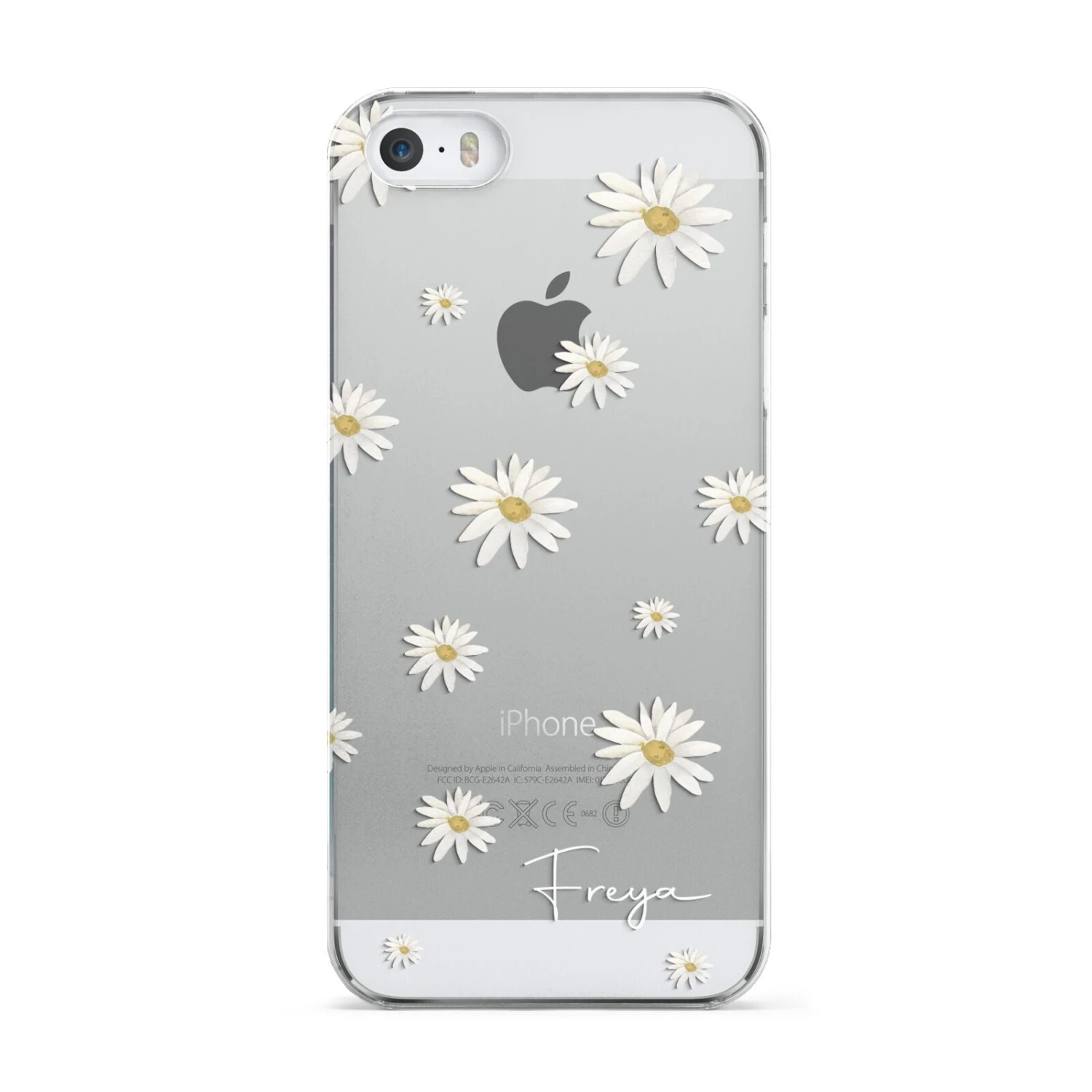 Our Personalised Vintage Daisy Apple iPhone Case is set on a transparent background with a custom name. Add any name you like and we will print it in our handwritten font.