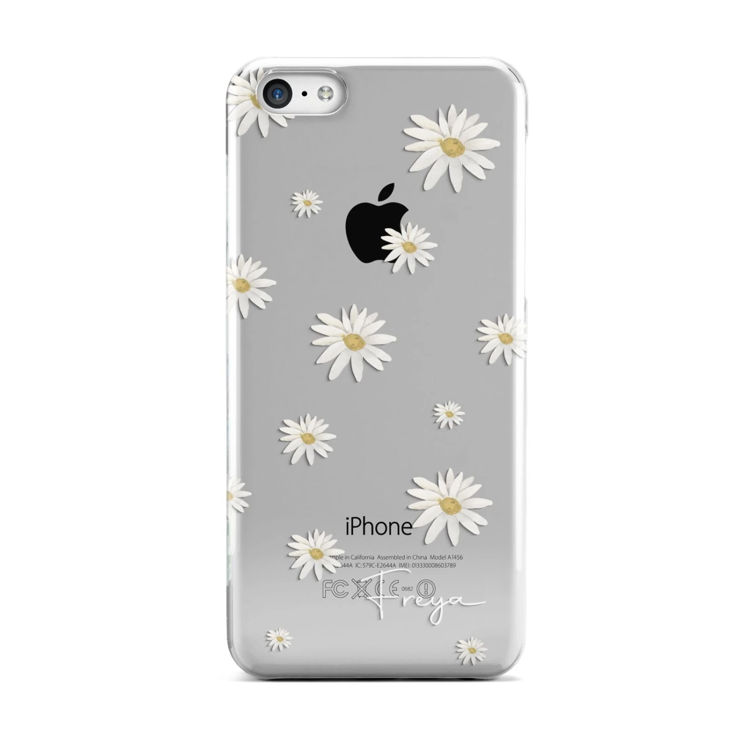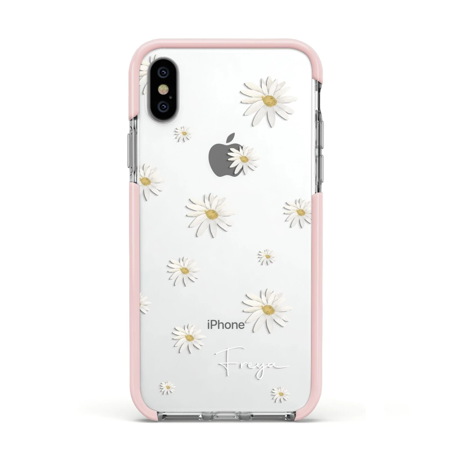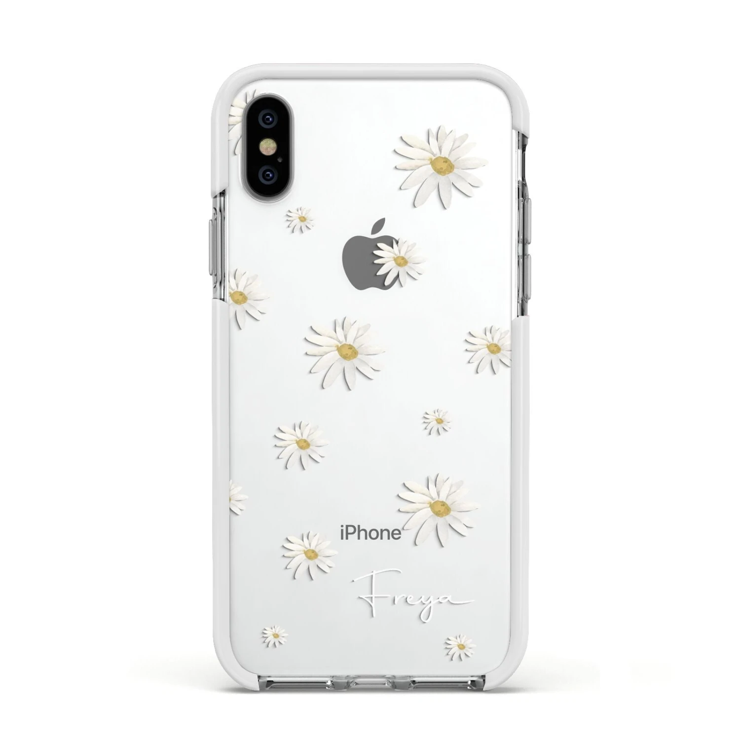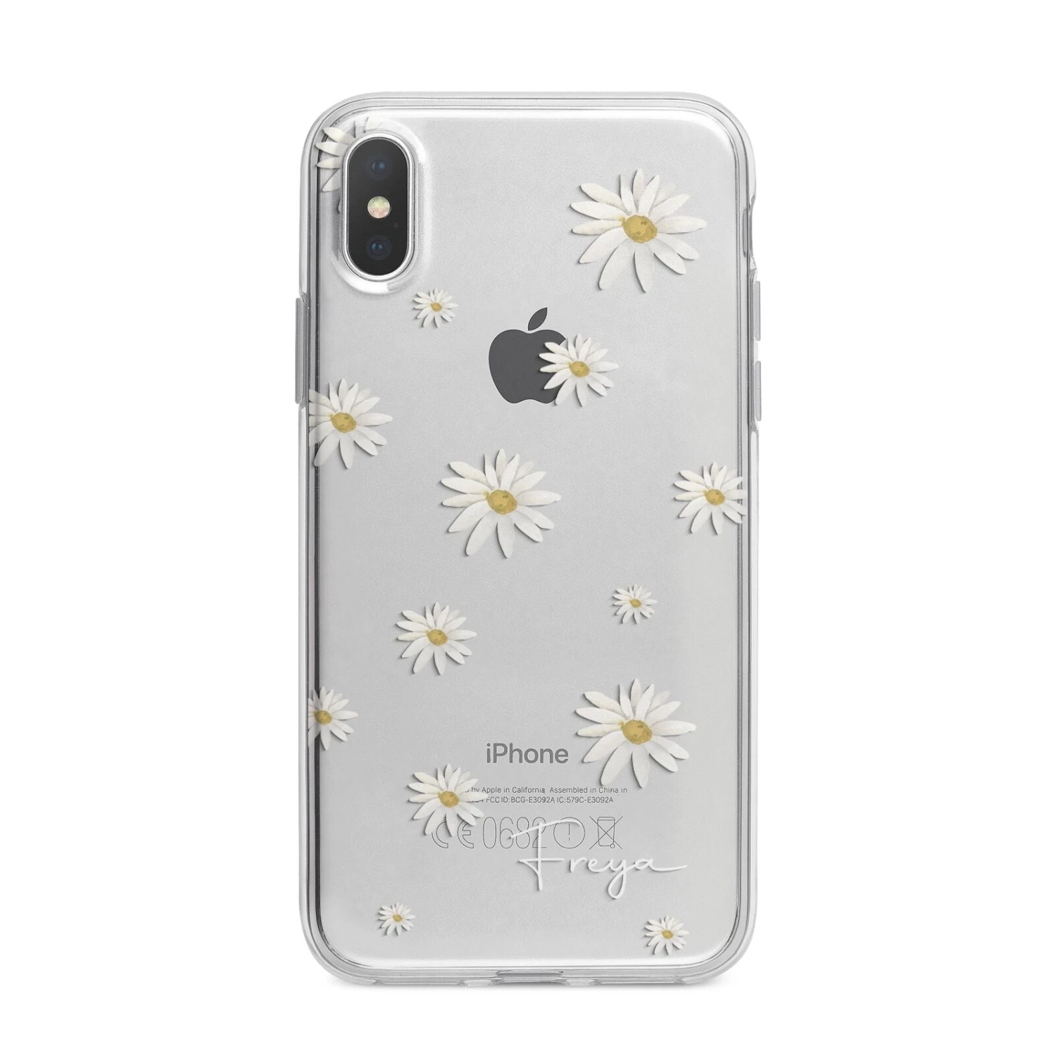 Our Personalised Vintage Daisy Apple iPhone Case is set on a transparent background with a custom name. Add any name you like and we will print it in our handwritten font.