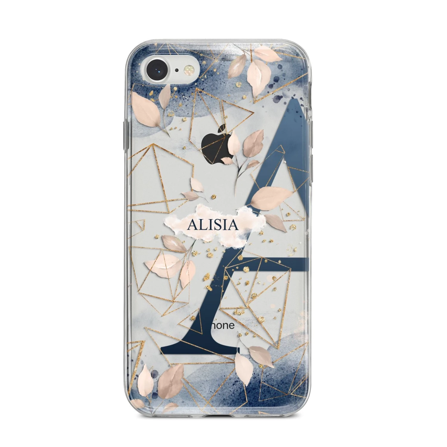 Our Personalised Watercolour Geometric Apple iPhone Case is a blue watercolour pattern, with gold geometric shapes and blue peonies. The pattern is personalised with a name in the centre and a striking large initial, off centre.
