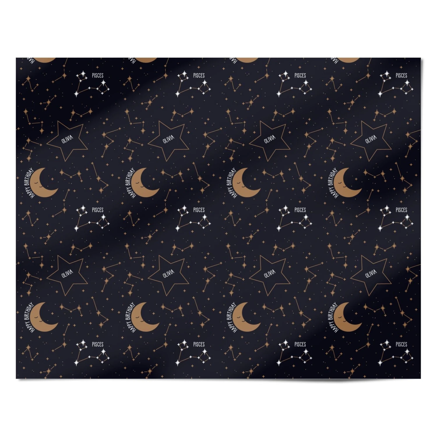Celebrate their special day with this customised zodiac-themed wrapping paper, featuring their name and star sign in a beautifully celestial design. The deep black background is adorned with shimmering gold stars, a crescent moon, and intricate constellations, creating a sophisticated astrology-inspired aesthetic.