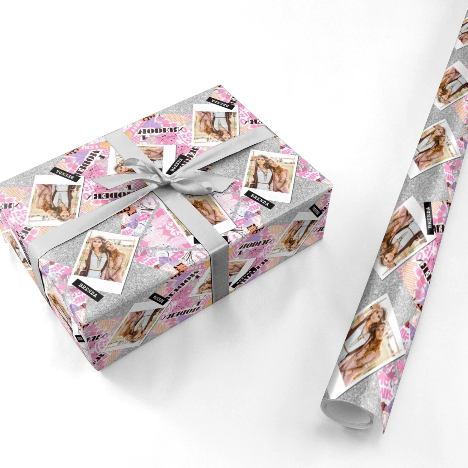 Our Picture Collage with Custom Photo Wrapping Paper is an aesthetic design with an abstract pink collage, with the ability to upload your own photograph and add a name or text. Perfect for the festival season.