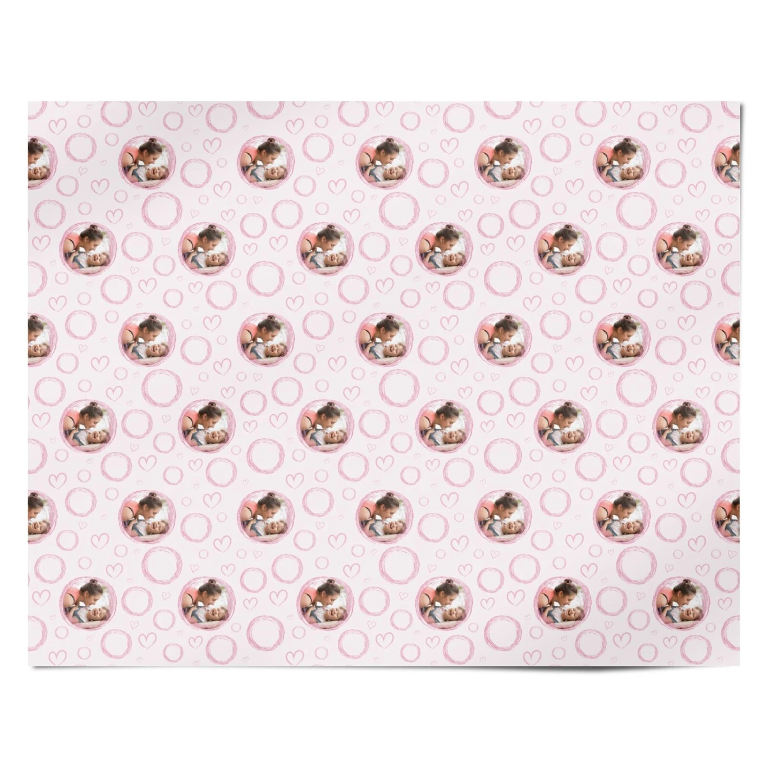 Our Pink Love Hearts Photo Personalised Wrapping Paper is a cute design with love hearts and abstract shapes patterned on a pink background. To the center of the design we have a photo within a circle. Upload your own favourite photograph to make it your own.