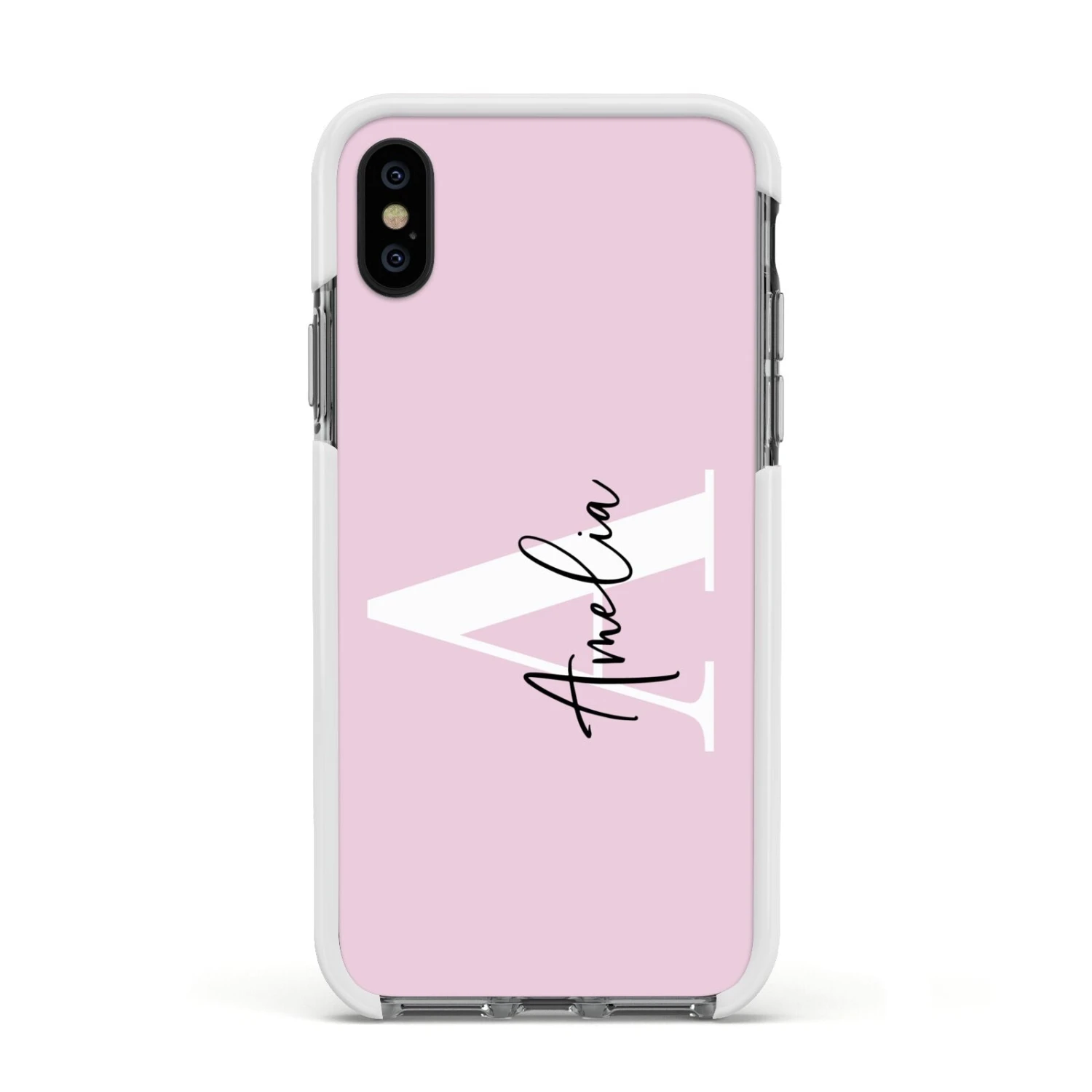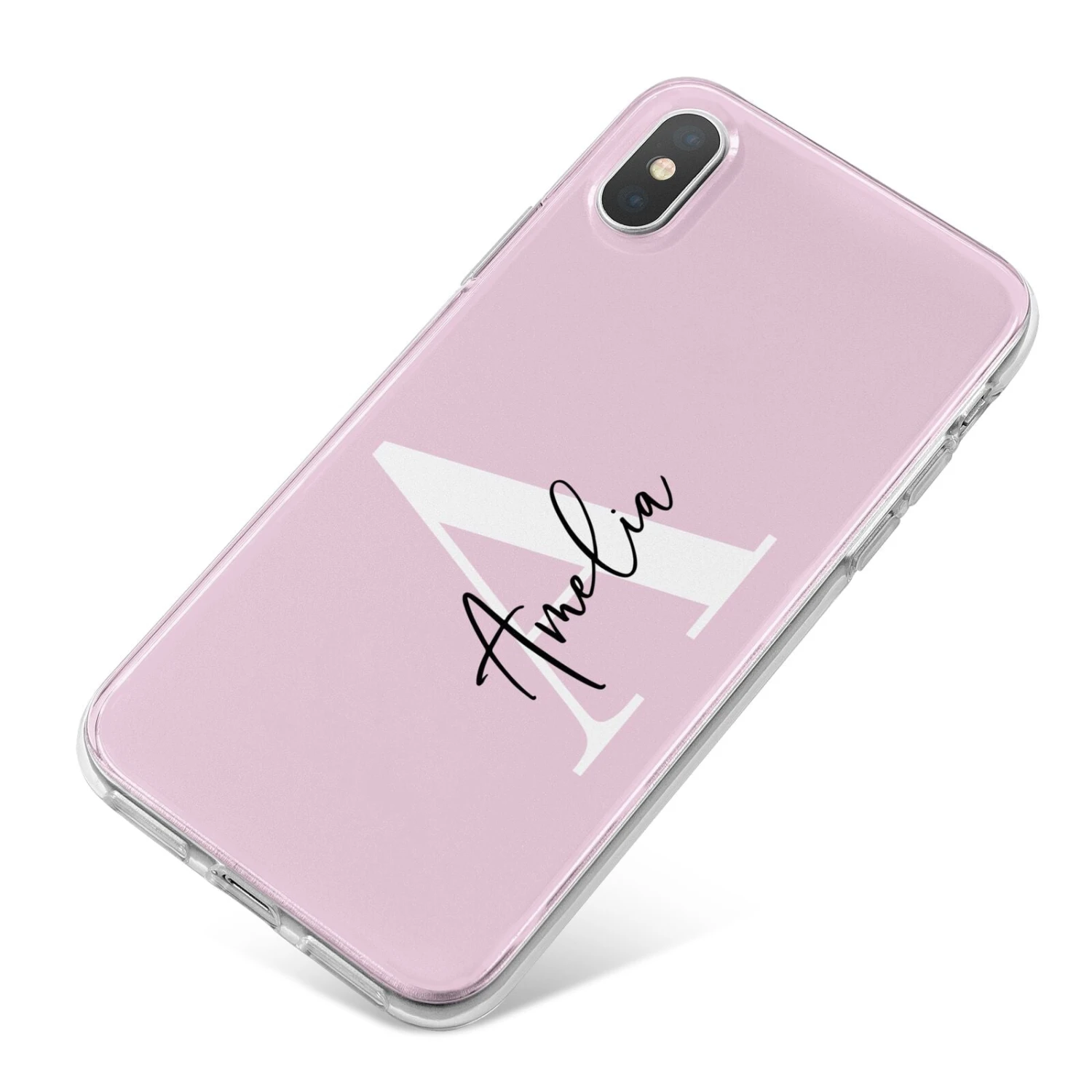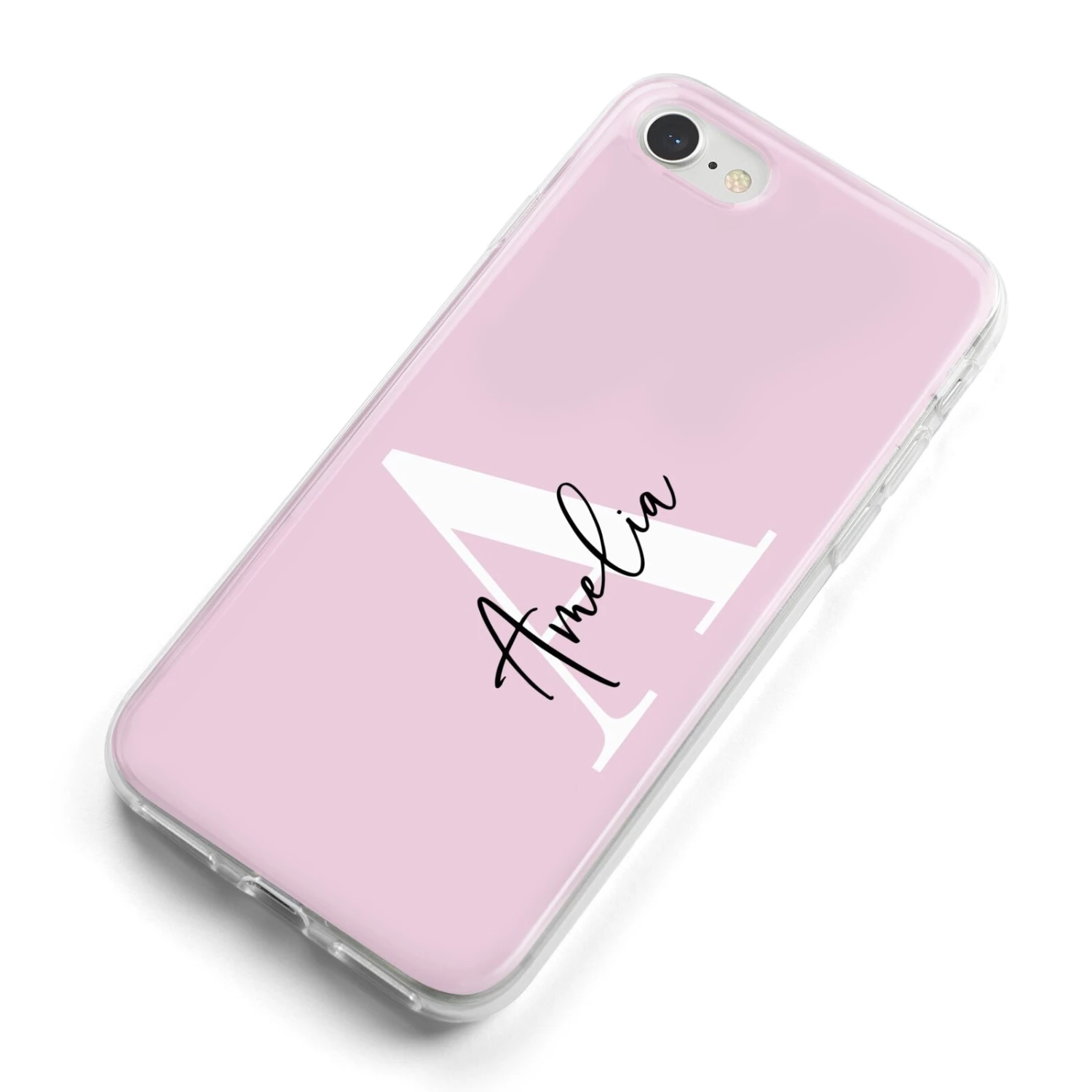 Super girly Apple iPhone Case, pink with a fully personalised initial and name space! This adorable personalised phone case is sure to show off your girly side with a solid pastel pink background. It features a fully customisable initial and name space. The initial is a solid, bold, white font that is sure to make you stand out from the crowd, with the customisable name space being in a cute, cursive font, black font. Shout your name and your diva style from the rooftops with this ultra feminine phone case!