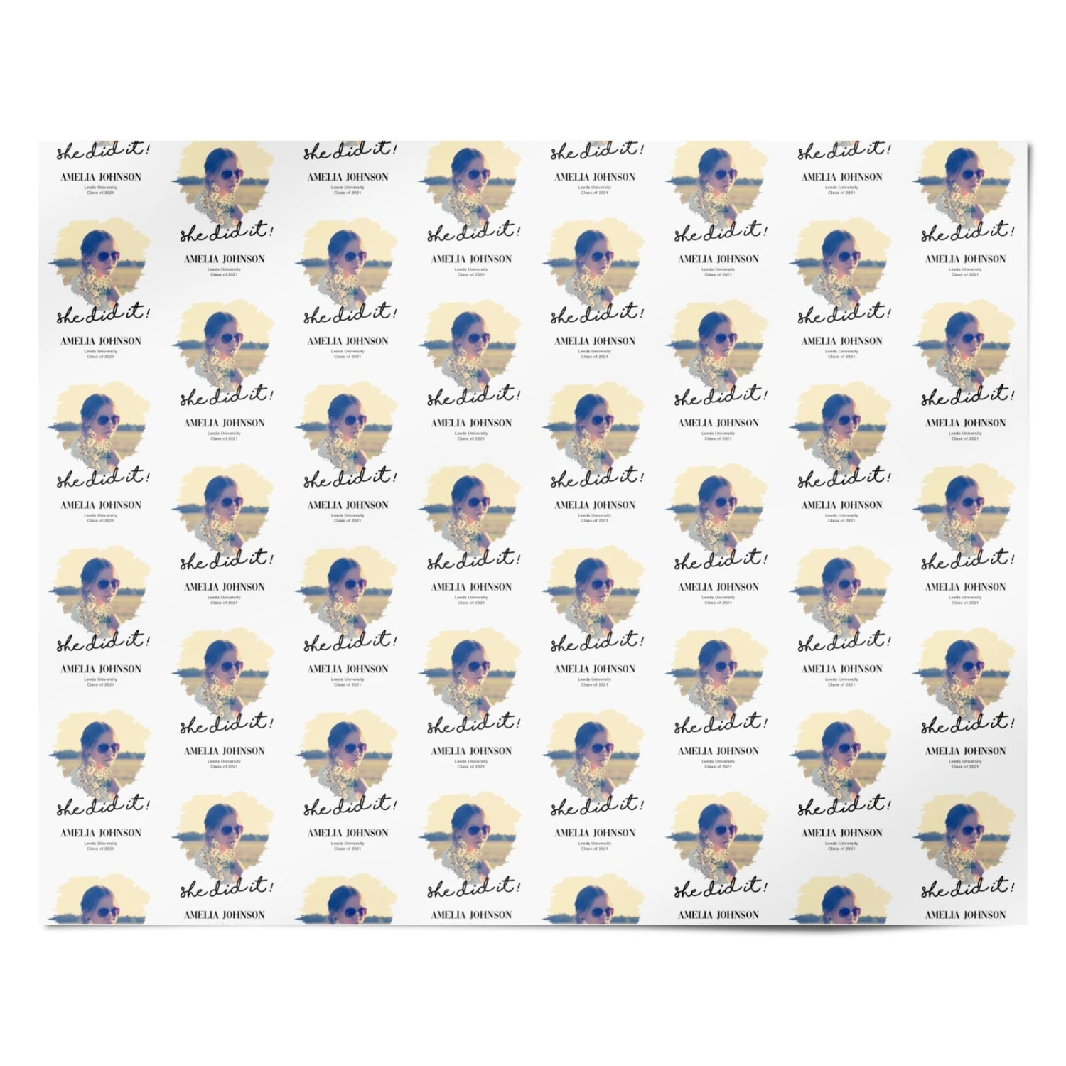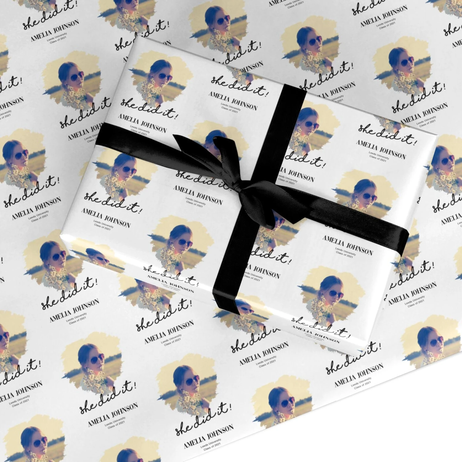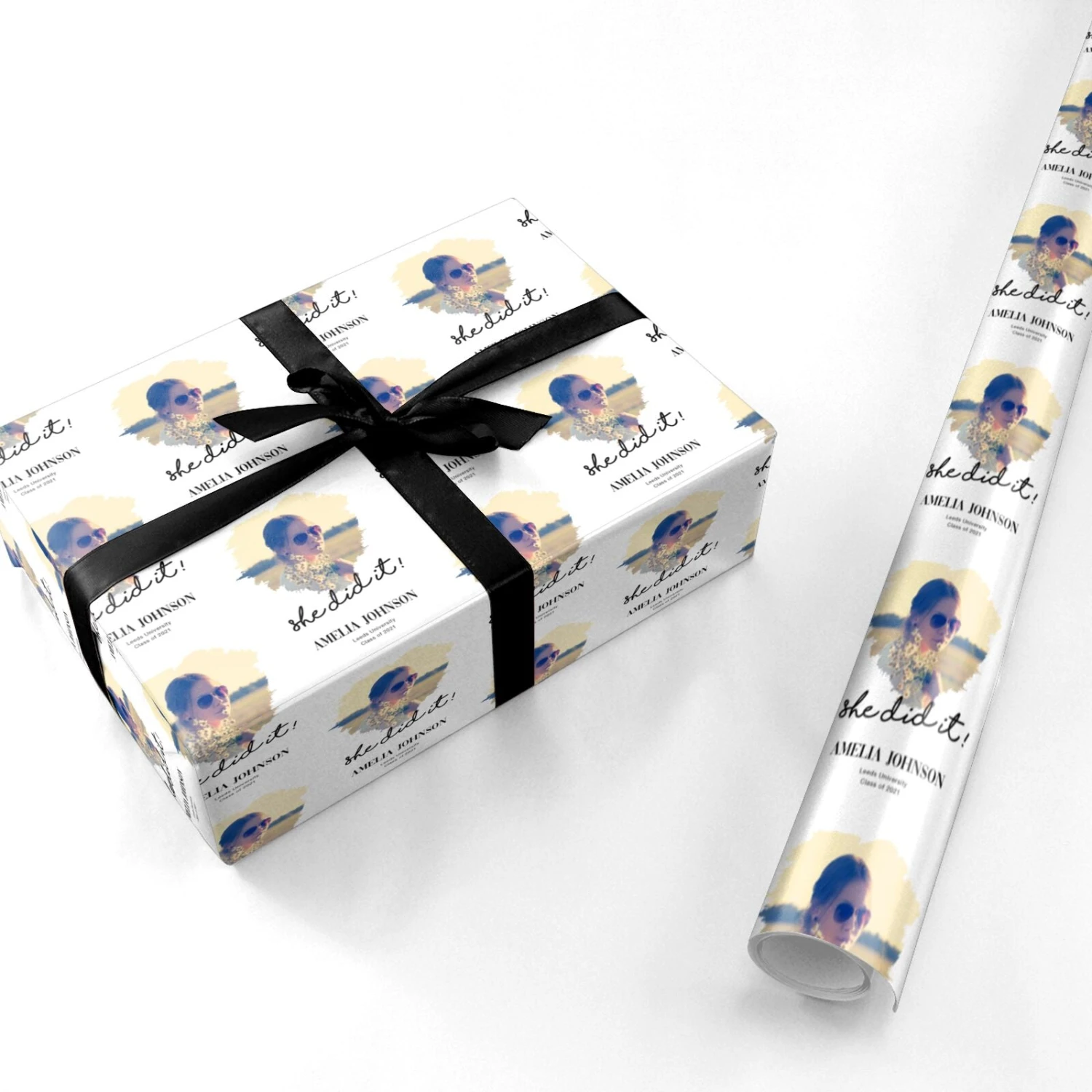 This graduation gift is the perfect way to commemorate your loved one’s successes. This chic gift wrap features a graduation design with a difference. The design has a minimalist soft grey backdrop, and a modern brushstroke photo frame. Then, you can make your She Did It Graduation Photo with Name Wrapping Paper one of a kind by adding in your own bespoke details. Simply upload your favourite photo of the new graduate, along with her name, and the details of the graduation ceremony. With this gift, she can remember this special day forever.Â