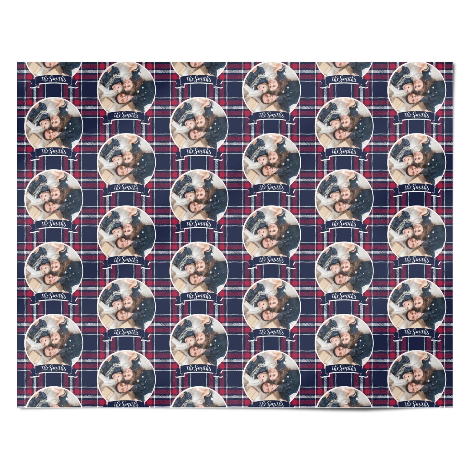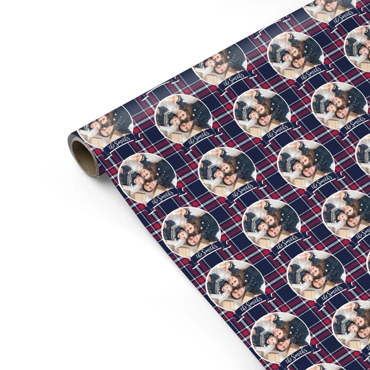 Our Tartan Christmas Photo Personalised Wrapping Paper features a festive blue red and white tartan pattern, with a custom photo inset, above personalised text or name. Our gift wrap makes a perfect gift for friends or family this Christmas.