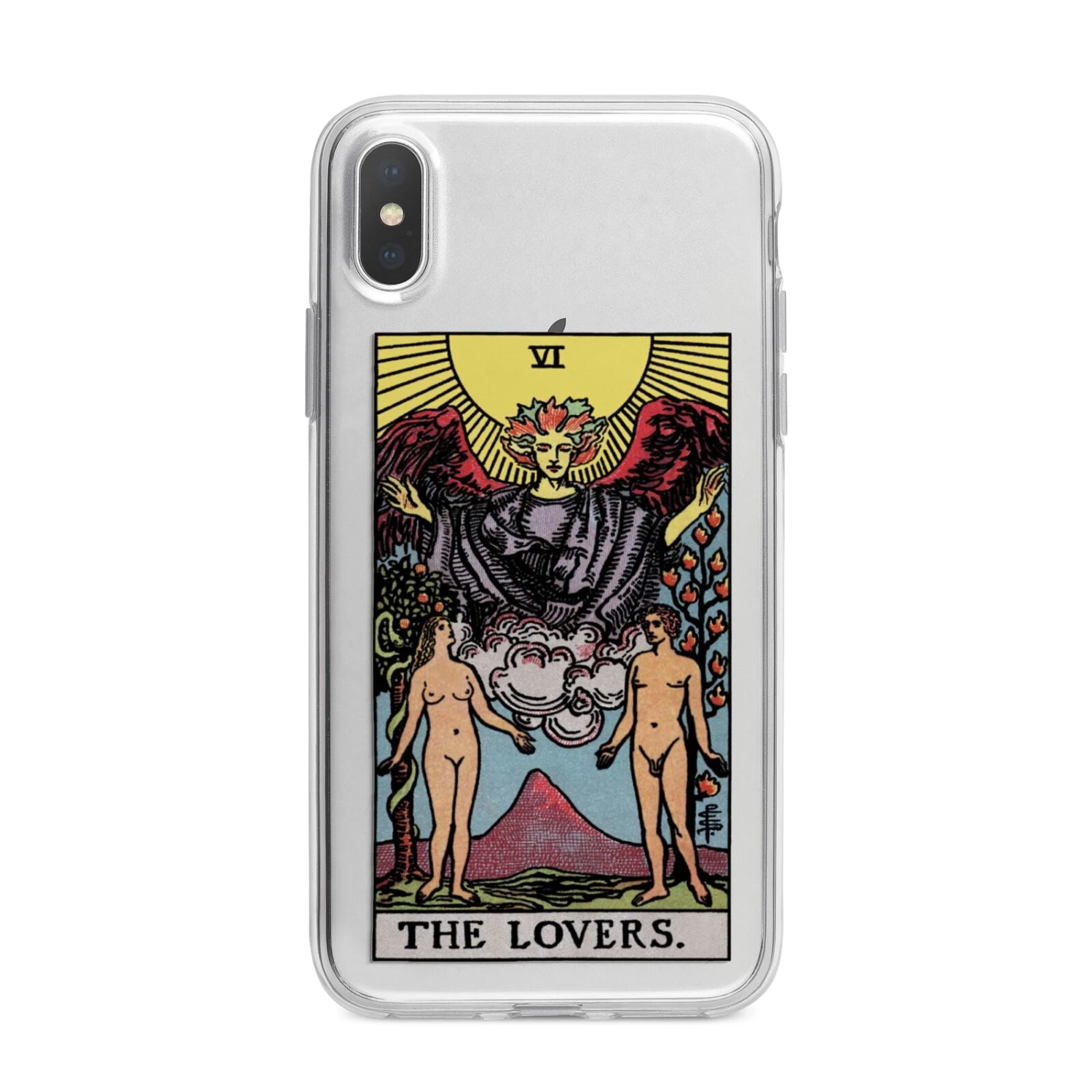 In this phone case design, we’ve featured our take on one of the most iconic Tarot cards in existence – The Lovers. For this bold, statement design, we’ve featured the characters of “The Lovers”, which is a line drawn visualisation of Adam and Eve in the garden of Eden. Our The The Lovers Apple iPhone Case features them naked in the garden, surrounded by grass and nature. Then, above them, is a dramatic drawing of a deity, which is coloured in a stunning gold, red and green colour palette.