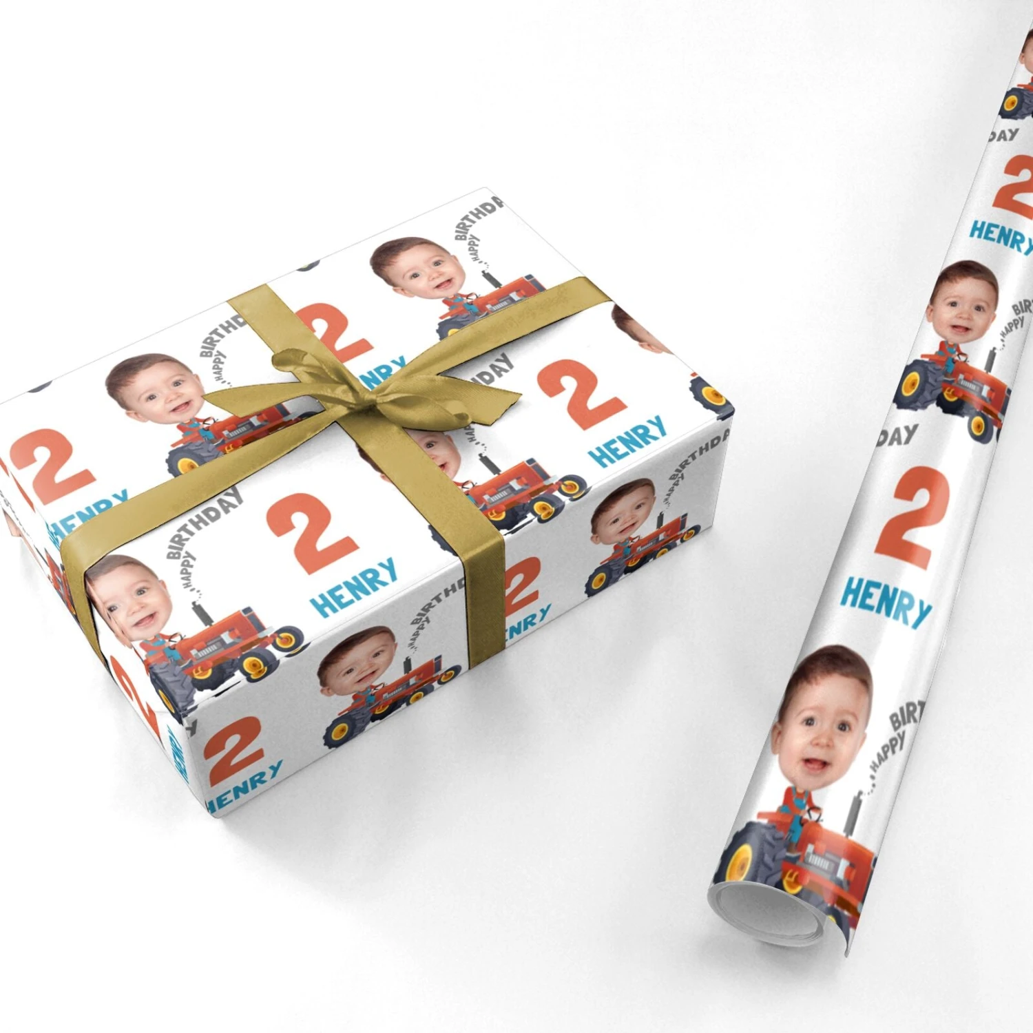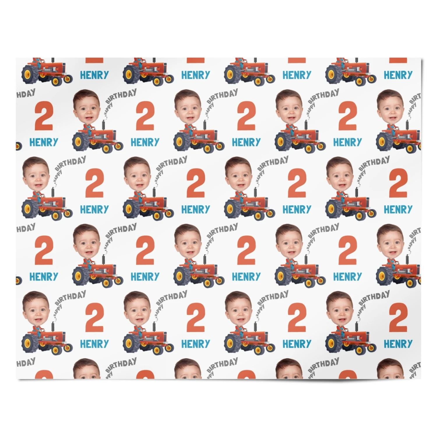 Celebrate a little farmer’s big day with this personalised tractor-themed wrapping paper. Featuring their name, age, and even their smiling face, this fun design is perfect for kids who love tractors and farm life. With bright colours and a playful layout, it makes birthday gifts extra special and memorable. Whether for a second birthday or any milestone year, this custom gift wrap brings joy before the present is even opened. Ideal for boys and tractor-loving tots.
