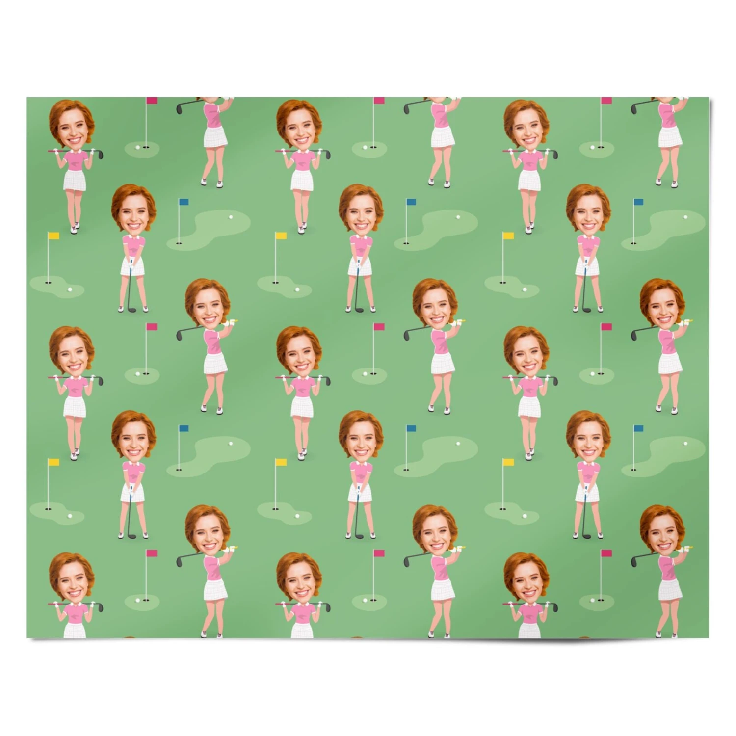 Tee up the perfect gift with our Women’s Golf Photo Face Wrapping Paper! This personalised wrapping paper turns any golf lover’s face into a fun, sporty design. Simply upload a photo, and our tool will cut out the face and apply it to a playful golf-themed background filled with greens, flags, and cute golf poses. Printed on high-quality paper, this wrap not only looks fabulous but adds a unique, personal touch to your gift. Perfect for birthdays, celebrations, or just for fun, this wrapping paper is a hole-in-one for any golf enthusiast!